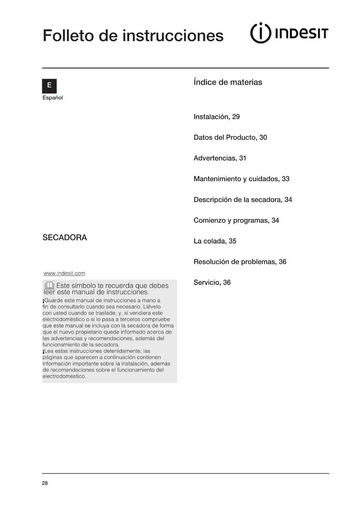 Español Folleto de instrucciones Índice de materias Instalación, 29 Datos del Producto, 30 Advertencias, 31 Mantenimiento y cuidados, 33 Descripción de la secadora, 34 Comienzo y programas, 34 La colada, 35 Resolución de problemas, 36 Servicio, 36 www.indesit.com SECADORA ¡Guarde este manual de instrucciones a mano a fin de consultarlo cuando sea necesario. Llévelo con usted cuando se traslade, y, si vendiera este electrodoméstico o si lo pasa a terceros compruebe que este manual se incluya con la secadora de forma que el nuevo propietario quede informado acerca de las advertencias y recomendaciones, además del funcionamiento de la secadora. ¡Lea estas instrucciones detenidamente; las páginas que aparecen a continuación contienen información importante sobre la instalación, además de recomendaciones sobre el funcionamiento del electrodoméstico. Este símbolo te recuerda que debes leer este manual de instrucciones.E