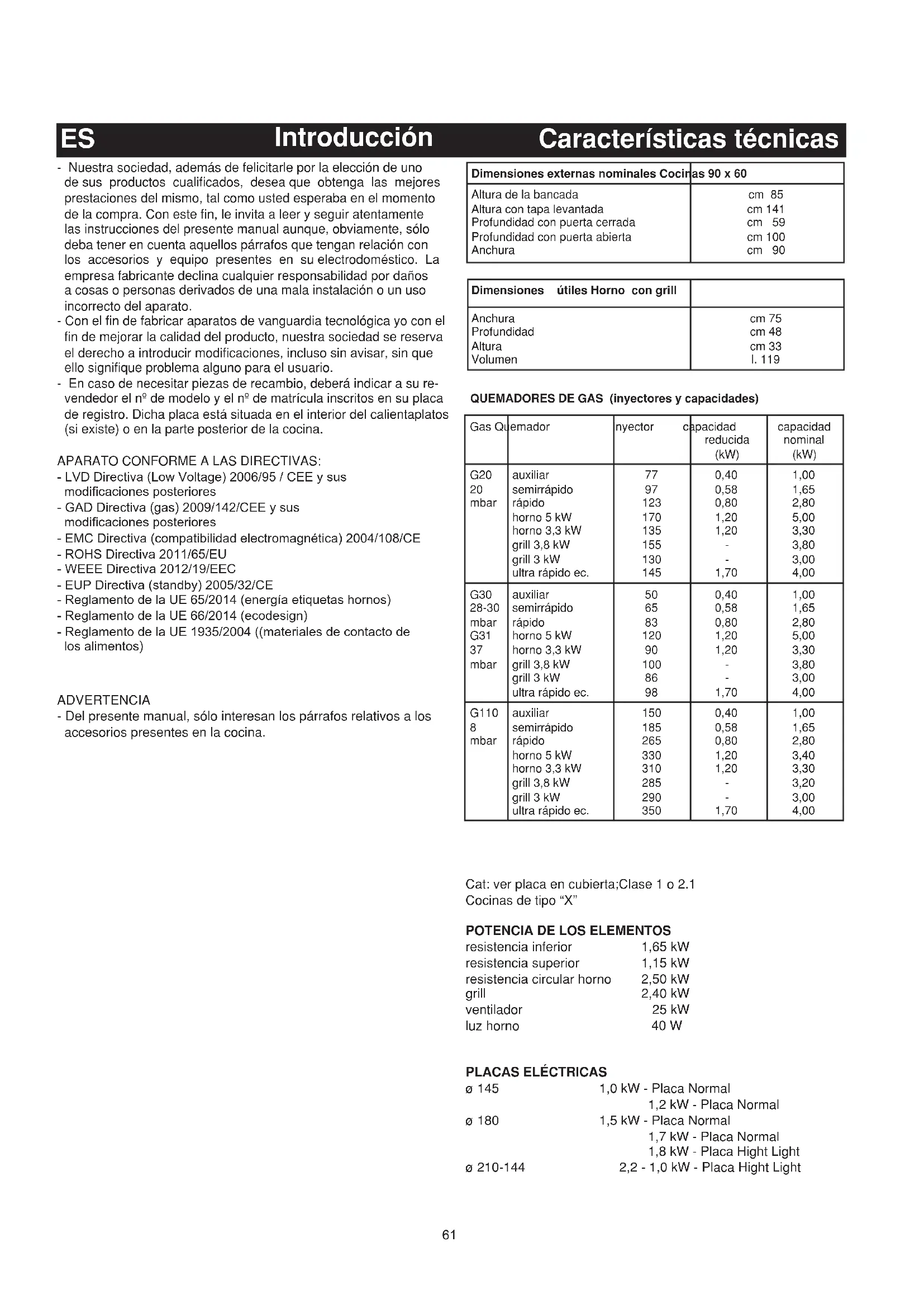 Introducción - Nuestra sociedad, además de felicitarle por la elección de uno de sus productos cualificados, desea que obtenga las mejores prestaciones del mismo, tal como usted esperaba en el momento de la compra. Con este fin, le invita a leer y seguir atentamente las instrucciones del presente manual aunque, obviamente, sólo deba tener en cuenta aquellos párrafos que tengan relación con los accesorios y equipo presentes en su electrodoméstico. La empresa fabricante declina cualquier responsabilidad por daños a cosas o personas derivados de una mala instalación o un uso incorrecto del aparato. - Con el fin de fabricar aparatos de vanguardia tecnológica yo con el fin de mejorar la calidad del producto, nuestra sociedad se reserva el derecho a introducir modificaciones, incluso sin avisar, sin que ello signifique problema alguno para el usuario. - En caso de necesitar piezas de recambio, deberá indicar a su re- vendedor el nº de modelo y el nº de matrícula inscritos en su placa de registro. Dicha placa está situada en el interior del calientaplatos (si existe) o en la parte posterior de la cocina. APARATO CONFORME A LAS DIRECTIVAS: - LVD Directiva (Low Voltage) 2006/95 / CEE y sus modificaciones posteriores - GAD Directiva (gas) 2009/142/CEE y sus modificaciones posteriores - EMC Directiva (compatibilidad electromagnética) 2004/108/CE - ROHS Directiva 2011/65/EU - WEEE Directiva 2012/19/EEC - EUP Directiva (standby) 2005/32/CE - Reglamento de la UE 65/2014 (energía etiquetas hornos) - Reglamento de la UE 66/2014 (ecodesign) - Reglamento de la UE 1935/2004 ((materiales de contacto de los alimentos) ADVERTENCIA - Del presente manual, sólo interesan los párrafos relativos a los accesorios presentes en la cocina. Características técnicas Dimensiones externas nominales Cocinas 90 x 60 Altura de la bancada Altura con tapa levantada Profundidad con puerta cerrada Profundidad con puerta abierta Anchura cm 85 cm 141 cm 59 cm 100 cm 90 Dimensiones útiles Horno con grill Anchura Profundidad Altura Volumen cm 75 cm 48 cm 33 l. 119 Gas Quemador Inyector capacidad reducida (kW) capacidad nominal (kW) G20