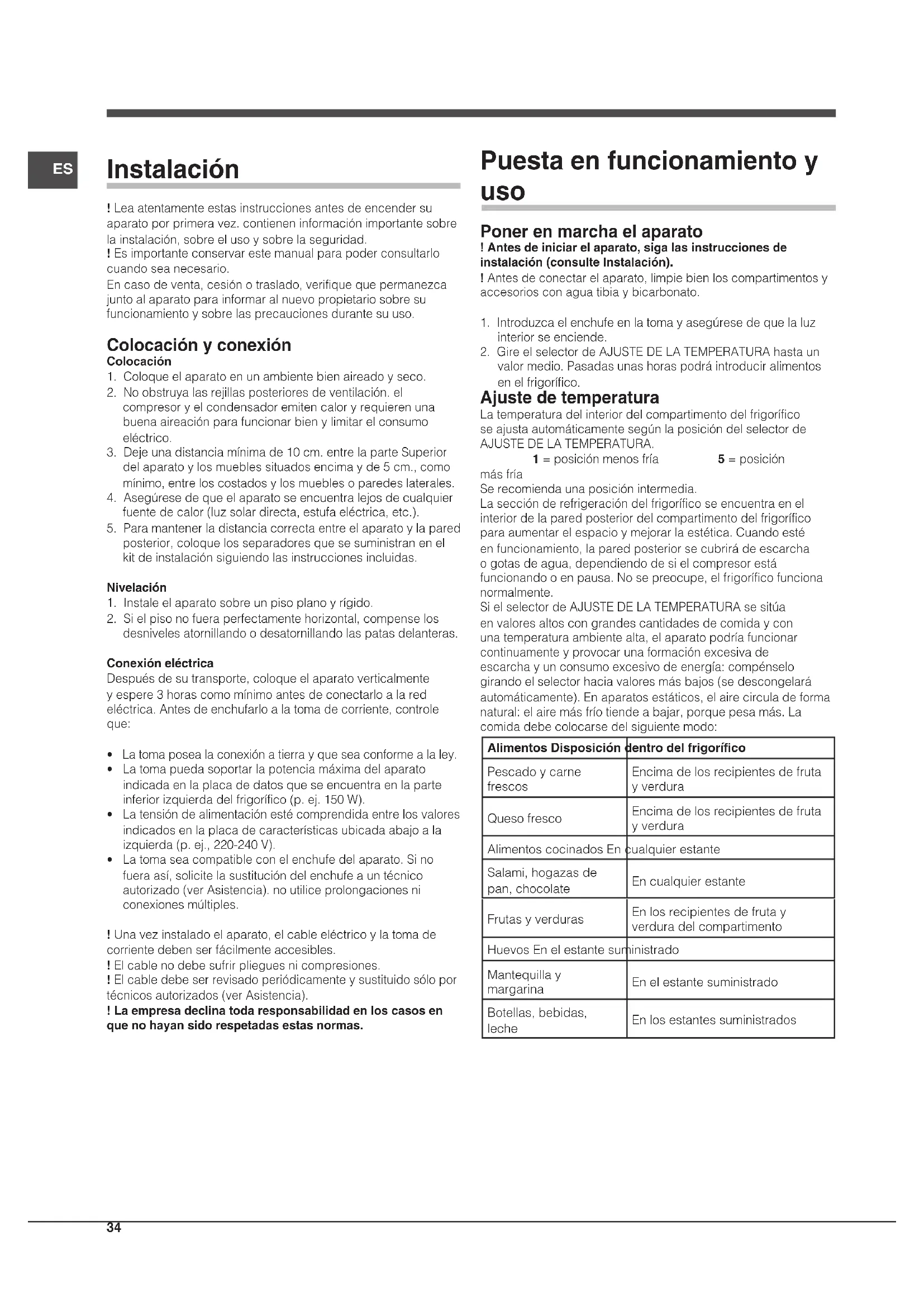 valor medio. Pasadas unas horas podrá introducir alimentos en el frigorífico. Ajuste de temperatura La temperatura del interior del compartimento del frigorífico se ajusta automáticamente según la posición del selector de AJUSTE DE LA TEMPERATURA. 1 = posición menos fría 5 = posición más fría Se recomienda una posición intermedia. La sección de refrigeración del frigorífico se encuentra en el interior de la pared posterior del compartimento del frigorífico para aumentar el espacio y mejorar la estética. Cuando esté en funcionamiento, la pared posterior se cubrirá de escarcha o gotas de agua, dependiendo de si el compresor está funcionando o en pausa. No se preocupe, el frigorífico funciona normalmente. Si el selector de AJUSTE DE LA TEMPERATURA se sitúa en valores altos con grandes cantidades de comida y con una temperatura ambiente alta, el aparato podría funcionar continuamente y provocar una formación excesiva de escarcha y un consumo excesivo de energía: compénselo girando el selector hacia valores más bajos (se descongelará automáticamente). En aparatos estáticos, el aire circula de forma natural: el aire más frío tiende a bajar, porque pesa más. La comida debe colocarse del siguiente modo: Alimentos Disposición dentro del frigorífico Pescado y carne frescos Encima de los recipientes de fruta y verdura Queso fresco Encima de los recipientes de fruta y verdura Alimentos cocinados En cualquier estante Salami, hogazas de pan, chocolate En cualquier estante Frutas y verduras En los recipientes de fruta y verdura del compartimento Huevos En el estante suministrado Mantequilla y margarina En el estante suministrado Botellas, bebidas, leche En los estantes suministradosES