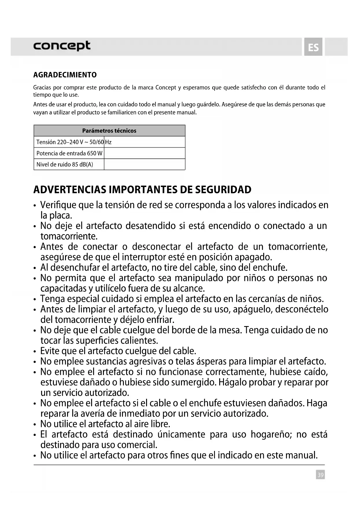 AGRADECIMIENTO Gracias por comprar este producto de la marca Concept y esperamos que quede satisfecho con él durante todo el tiempo que lo use. Antes de usar el producto, lea con cuidado todo el manual y luego guárdelo. Asegúrese de que las demás personas que vayan a utilizar el producto se familiaricen con el presente manual. Parámetros técnicos Tensión 220–240 V ~ 50/60 Hz Potencia de entrada 650 W Nivel de ruido 85 dB(A)