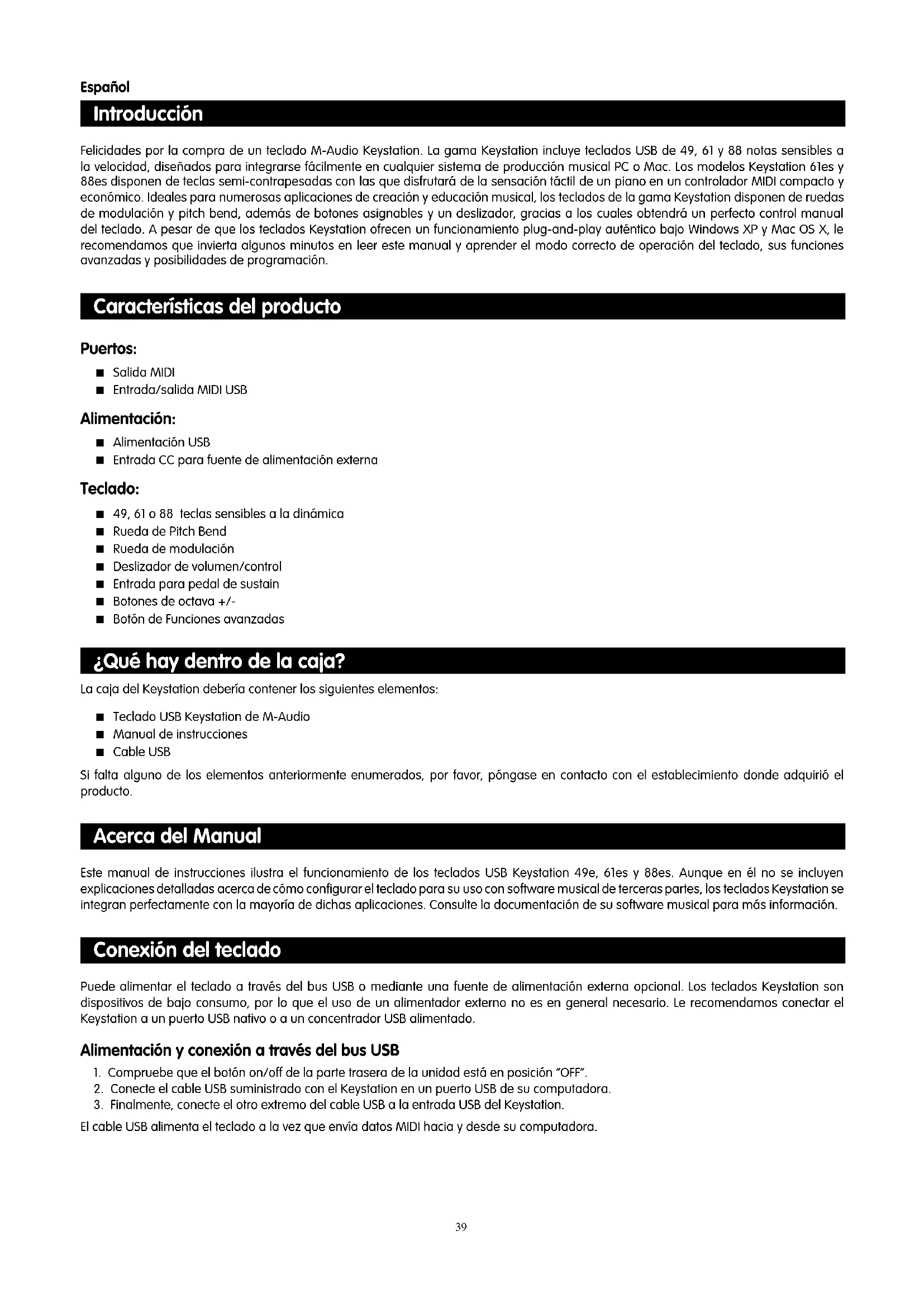 - Sysex-Meldungen ** MMC-Sysex-Meldungen. *** Dieser Wert kann nicht über den Ziffernblock eingegeben werden! Geben Sie die Ziffernfolge "144" ein und drücken Sie Preset "+", um den Wert zu programmieren.39 Introducción Felicidades por la compra de un teclado M-Audio Keystation. La gama Keystation incluye teclados USB de 49, 61 y 88 notas sensibles a la velocidad, diseñados para integrarse fácilmente en cualquier sistema de producción musical PC o Mac. Los modelos Keystation 61es y 88es disponen de teclas semi-contrapesadas con las que disfrutará de la sensación táctil de un piano en un controlador MIDI compacto y económico. Ideales para numerosas aplicaciones de creación y educación musical, los teclados de la gama Keystation disponen de ruedas de modulación y pitch bend, además de botones asignables y un deslizador, gracias a los cuales obtendrá un perfecto control manual del teclado. A pesar de que los teclados Keystation ofrecen un funcionamiento plug-and-play auténtico bajo Windows XP y Mac OS X, le recomendamos que invierta algunos minutos en leer este manual y aprender el modo correcto de operación del teclado, sus funciones avanzadas y posibilidades de programación. Características del producto Puertos: < Salida MIDI < Entrada/salida MIDI USB Alimentación: < Alimentación USB < Entrada CC para fuente de alimentación externa Teclado: < 49, 61 o 88 teclas sensibles a la dinámica < Rueda de Pitch Bend < Rueda de modulación < Deslizador de volumen/control < Entrada para pedal de sustain < Botones de octava +/- < Botón de Funciones avanzadas ¿Qué hay dentro de la caja? La caja del Keystation debería contener los siguientes elementos: < Teclado USB Keystation de M-Audio < Manual de instrucciones < Cable USB Si falta alguno de los elementos anteriormente enumerados, por favor, póngase en contacto con el establecimiento donde adquirió el producto. Acerca del Manual Este manual de instrucciones ilustra el funcionamiento de los teclados USB Keystation 49e, 61es y 88es. Aunque en él no se incluyen explicaciones detalladas acerca de cómo configurar el teclado para su uso con software musical de terceras partes, los teclados Keystation se integran perfectamente con la mayoría de dichas aplicaciones. Consulte la documentación de su software musical para más información. Conexión del teclado Puede alimentar el teclado a través del bus USB o mediante una fuente de alimentación externa opcional. Los teclados Keystation son dispositivos de bajo consumo, por lo que el uso de un alimentador externo no es en general necesario. Le recomendamos conectar el Keystation a un puerto USB nativo o a un concentrador USB alimentado. Alimentación y conexión a través del bus USB