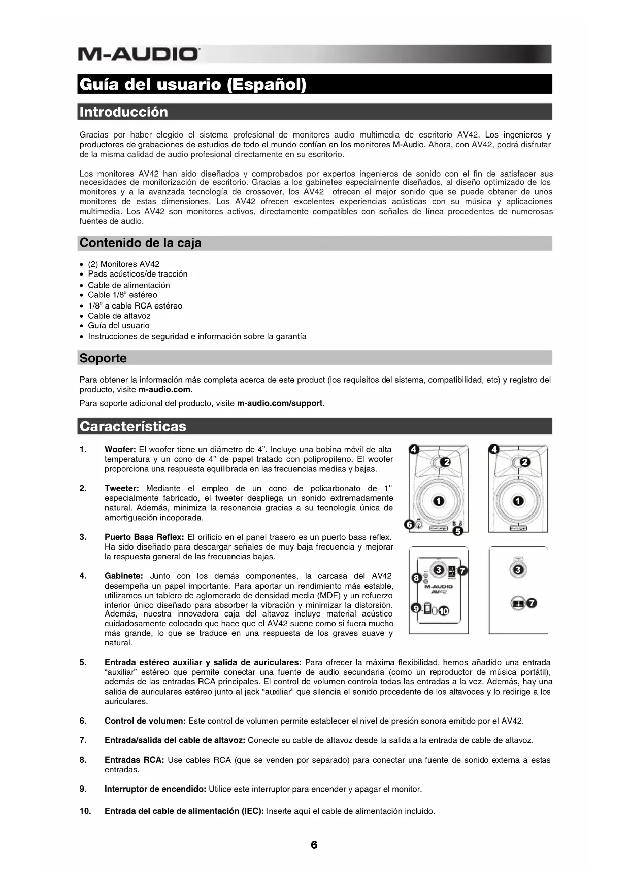 - (2) Monitores AV42 • Pads acústicos/de tracción • Cable de alimentación • Cable 1/8” estéreo • 1/8” a cable RCA estéreo • Cable de altavoz • Guía del usuario • Instrucciones de seguridad e información sobre la garantía Soporte Para obtener la información más completa acerca de este product (los requisitos del sistema, compatibilidad, etc) y registro del producto, visite m-audio.com. Para soporte adicional del producto, visite m-audio.com/support. Características