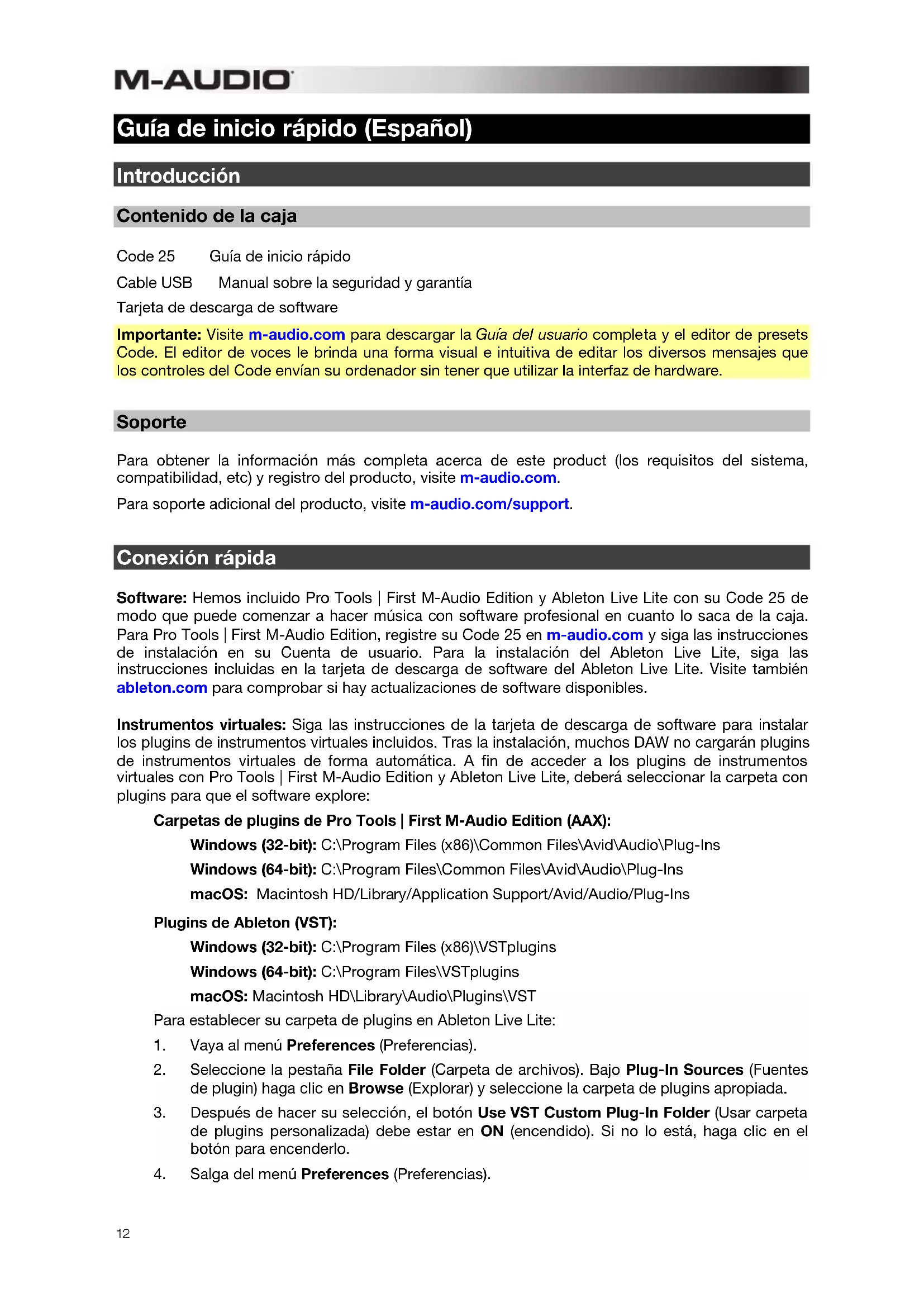 Guía de inicio rápido (Español) Introducción Contenido de la caja Code 25 Guía de inicio rápido Cable USB Manual sobre la seguridad y garantía Tarjeta de descarga de software Importante: Visite m-audio.com para descargar la Guía del usuario completa y el editor de presets Code. El editor de voces le brinda una forma visual e intuitiva de editar los diversos mensajes que los controles del Code envían su ordenador sin tener que utilizar la interfaz de hardware. Soporte Para obtener la información más completa acerca de este product (los requisitos del sistema, compatibilidad, etc) y registro del producto, visite m-audio.com. Para soporte adicional del producto, visite m-audio.com/support. Conexión rápida Software: Hemos incluido Pro Tools | First M-Audio Edition y Ableton Live Lite con su Code 25 de modo que puede comenzar a hacer música con software profesional en cuanto lo saca de la caja. Para Pro Tools | First M-Audio Edition, registre su Code 25 en m-audio.com y siga las instrucciones de instalación en su Cuenta de usuario. Para la instalación del Ableton Live Lite, siga las instrucciones incluidas en la tarjeta de descarga de software del Ableton Live Lite. Visite también ableton.com para comprobar si hay actualizaciones de software disponibles. Instrumentos virtuales: Siga las instrucciones de la tarjeta de descarga de software para instalar los plugins de instrumentos virtuales incluidos. Tras la instalación, muchos DAW no cargarán plugins de instrumentos virtuales de forma automática. A fin de acceder a los plugins de instrumentos virtuales con Pro Tools | First M-Audio Edition y Ableton Live Lite, deberá seleccionar la carpeta con plugins para que el software explore: Carpetas de plugins de Pro Tools | First M-Audio Edition (AAX): Windows (32-bit): C:\Program Files (x86)\Common Files\Avid\Audio\Plug-Ins Windows (64-bit): C:\Program Files\Common Files\Avid\Audio\Plug-Ins macOS: Macintosh HD/Library/Application Support/Avid/Audio/Plug-Ins Plugins de Ableton (VST): Windows (32-bit): C:\Program Files (x86)\VSTplugins Windows (64-bit): C:\Program Files\VSTplugins macOS: Macintosh HD\Library\Audio\Plugins\VST Para establecer su carpeta de plugins en Ableton Live Lite: