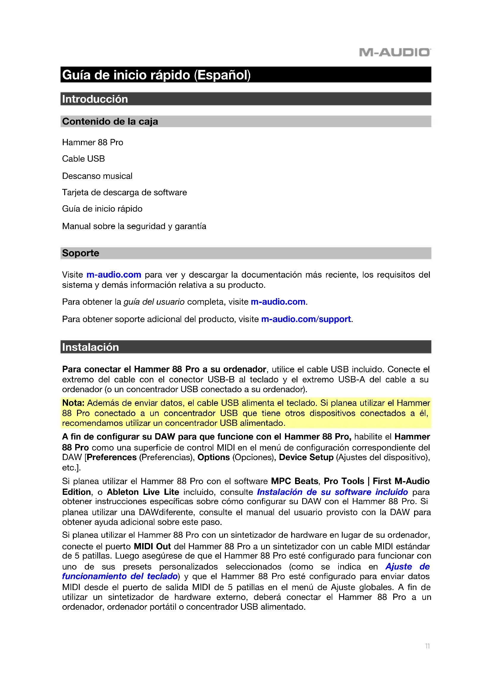 Edit Menus In addition to showing last used controls while performing, the Display (along with the Select/Scroll Encoder) is your main tool for editing various keyboard settings, including the MIDI assignments for editable controls, the settings for the keyboard’s internal functions (such as the arpeggiator), as well as global hardware settings. When you enter into an Edit menu for any keyboard function, the Display will show the name of the Edit menu, a setting field highlighted for editing, a parameter field showing the setting’s current status, and graphical blocks at the bottom of the screen to indicate how many other settings are available in the Edit menu. While entered into an Edit menu, the Display will have a white background with black text. To scroll through settings in an Edit menu, turn the Select/Scroll Encoder while the setting field is highlighted. To select a setting to edit, press the Select/Scroll Encoder while the setting field is highlighted. The parameter field will then be highlighted. To edit the setting parameter, select the setting to edit as described above. Then turn the Select/Scroll Encoder while the parameter field is highlighted. Once the desired parameter is highlighted, press the Select/Scroll Encoder to confirm the edit. The Display will then go back to highlighting the setting field. To exit the Edit menu without saving changes, press the Back Button. To exit the Edit menu and save changes, press the DAW Button (if editing the User DAW), or the Preset Button (if editing a Preset). Note: The settings that are available in the Edit menu may change depending on what parameters you select. For example, the Arpeggiator Edit menu varies depending on the selected parameter for the Arpeggiator Type setting.11 Guía de inicio rápido (Español) Introducción Contenido de la caja Hammer 88 Pro Cable USB Descanso musical Tarjeta de descarga de software Guía de inicio rápido Manual sobre la seguridad y garantía Soporte Visite m-audio.com para ver y descargar la documentación más reciente, los requisitos del sistema y demás información relativa a su producto. Para obtener la guía del usuario completa, visite m-audio.com. Para obtener soporte adicional del producto, visite m-audio.com/support. Instalación Para conectar el Hammer 88 Pro a su ordenador, utilice el cable USB incluido. Conecte el extremo del cable con el conector USB-B al teclado y el extremo USB-A del cable a su ordenador (o un concentrador USB conectado a su ordenador). Nota: Además de enviar datos, el cable USB alimenta el teclado. Si planea utilizar el Hammer 88 Pro conectado a un concentrador USB que tiene otros dispositivos conectados a él, recomendamos utilizar un concentrador USB alimentado. A fin de configurar su DAW para que funcione con el Hammer 88 Pro, habilite el Hammer 88 Pro como una superficie de control MIDI en el menú de configuración correspondiente del DAW [Preferences (Preferencias), Options (Opciones), Device Setup (Ajustes del dispositivo), etc.]. Si planea utilizar el Hammer 88 Pro con el software MPC Beats, Pro Tools | First M-Audio Edition, o Ableton Live Lite incluido, consulte Instalación de su software incluido para obtener instrucciones específicas sobre cómo configurar su DAW con el Hammer 88 Pro. Si planea utilizar una DAWdiferente, consulte el manual del usuario provisto con la DAW para obtener ayuda adicional sobre este paso. Si planea utilizar el Hammer 88 Pro con un sintetizador de hardware en lugar de su ordenador, conecte el puerto MIDI Out del Hammer 88 Pro a un sintetizador con un cable MIDI estándar de 5 patillas. Luego asegúrese de que el Hammer 88 Pro esté configurado para funcionar con uno de sus presets personalizados seleccionados (como se indica en Ajuste de funcionamiento del teclado) y que el Hammer 88 Pro esté configurado para enviar datos MIDI desde el puerto de salida MIDI de 5 patillas en el menú de Ajuste globales. A fin de utilizar un sintetizador de hardware externo, deberá conectar el Hammer 88 Pro a un ordenador, ordenador portátil o concentrador USB alimentado.12 Instalación de su software incluido Hemos incluido MPC Beats, Pro Tools | First M-Audio Edition, y Ableton Live Lite junto con el Hammer 88 Pro para que pueda comenzar a hacer música con software profesional ni bien lo saque de su caja. Adicionalmente, hemos incluido un conjunto de paquetes de expansión y plugins de instrumentos virtuales de AIR para que los utilice con su DAW. Para descargar el software MPC Beats, Pro Tools | First M-Audio Edition, o Ableton Live Lite incluido, registre su Hammer 88 Pro en m-audio.com y siga las instrucciones de instalación en su Cuenta de usuario. Si planea utilizar Ableton Live Lite, la recomendamos visitar ableton.com para comprobar si existen actualizaciones de software disponibles. Para obtener ayuda sobre cómo configurar cualquiera de esas DAW con Hammer 88 Pro, consulte Configuración de Pro Tools | First M-Audio Edition o Configuración de Ableton Live Lite Setup a continuación. Para descargar los plugins de instrumentos virtuales de AIR, siga las instrucciones que se encuentran en la tarjeta de descarga del software en la caja. Tras la instalación, la mayoría de las DAW no cargarán los plugins de instrumento virtual automáticamente; es posible que tenga que seleccionar una carpeta que contenga plugins manualmente para que su software la escanee. Las carpetas de plugins del Pro Tools | First M-Audio Edition y el Ableton Live Lite dependen de su sistema operativo, como se indica a continuación. Carpetas de plugins Pro Tools | First M-Audio Edition/AAX: