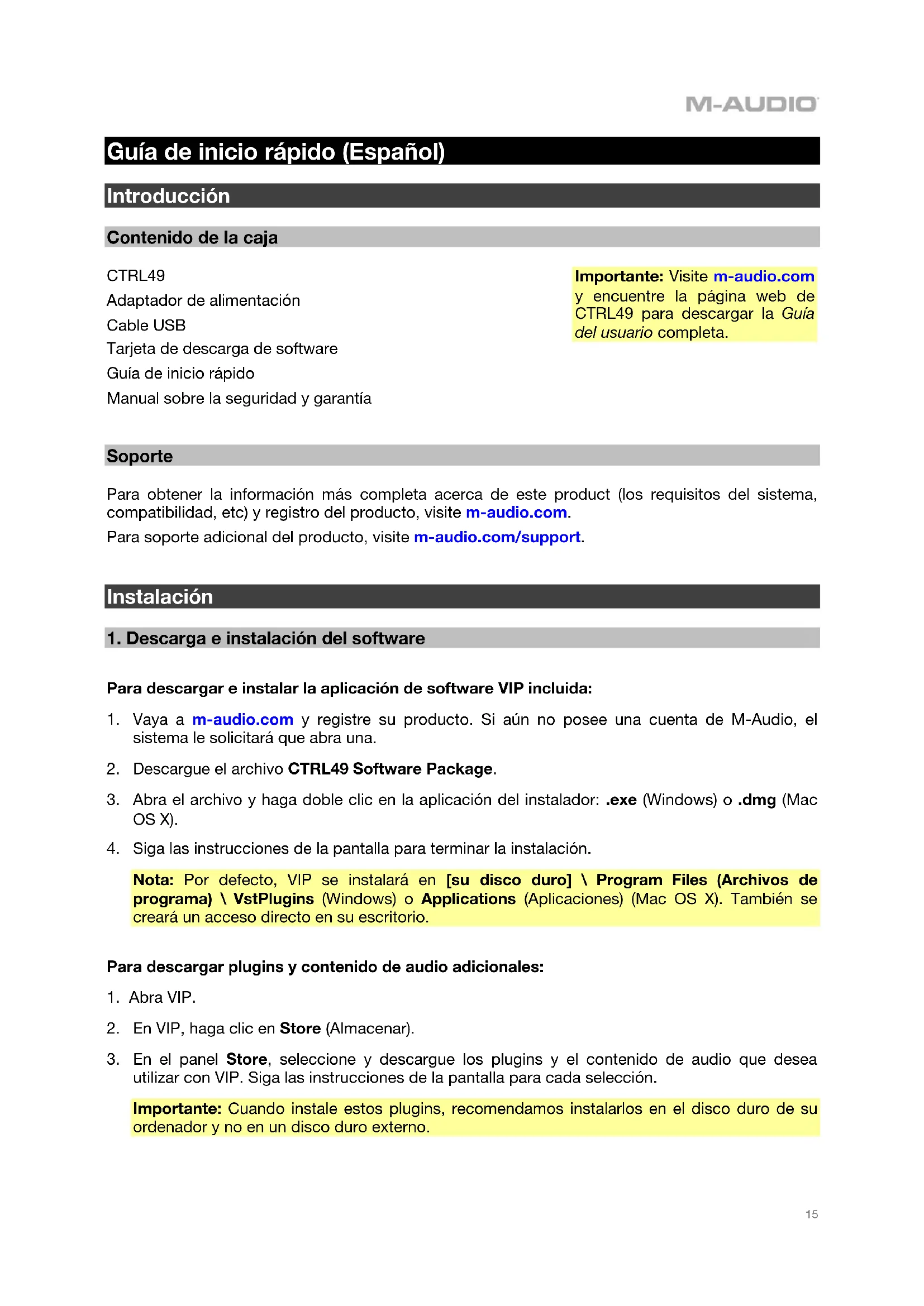 utilizar con VIP. Siga las instrucciones de la pantalla para cada selección. Importante: Cuando instale estos plugins, recomendamos instalarlos en el disco duro de su ordenador y no en un disco duro externo. Importante: Visite m-audio.com y encuentre la página web de CTRL49 para descargar la Guía del usuario completa.16