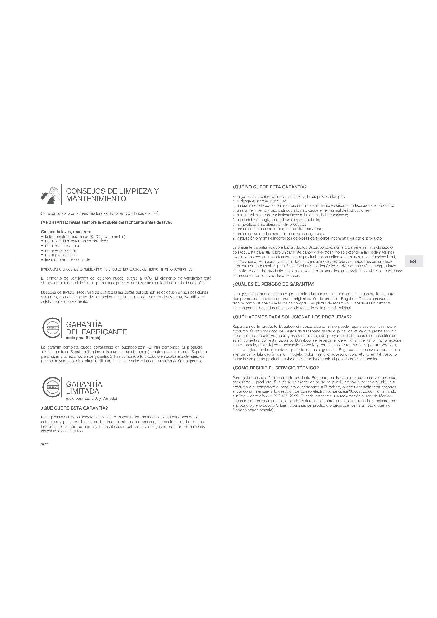 - lava siempre por separado Inspecciona el cochecito habitualmente y realiza las labores de mantenimiento pertinentes. El elemento de ventilación del colchón puede lavarse a 30˚C. El elemento de ventilación está situado encima del colchón de espuma más grueso y puede sacarse quitando la funda del colchón. Después del lavado, asegúrese de que todas las piezas del colchón se coloquen en sus posiciones originales, con el elemento de ventilación situado encima del colchón de espuma. No utilice el colchón sin dicho elemento. GARANTÍA DEL FABRICANTE (solo para Europa) La garantía completa puede consultarse en bugaboo.com. Si has comprado tu producto directamente en Bugaboo (tiendas de la marca o bugaboo.com), ponte en contacto con Bugaboo para hacer una reclamación de garantía. Si has comprado tu producto en cualquiera de nuestros puntos de venta ociales, dirígete allí para más información y hacer una reclamación de garantía. GARANTÍA LIMITADA (solo para EE. UU. y Canadá) ¿QUÉ CUBRE ESTA GARANTÍA? Esta garantía cubre los defectos en el chasis, la estructura, las ruedas, los adaptadores de la estructura y para las sillas de coche, las cremalleras, los arneses, las costuras de las fundas, las cintas adhesivas de nailon y la decoloración del producto Bugaboo, con las excepciones indicadas a continuación.