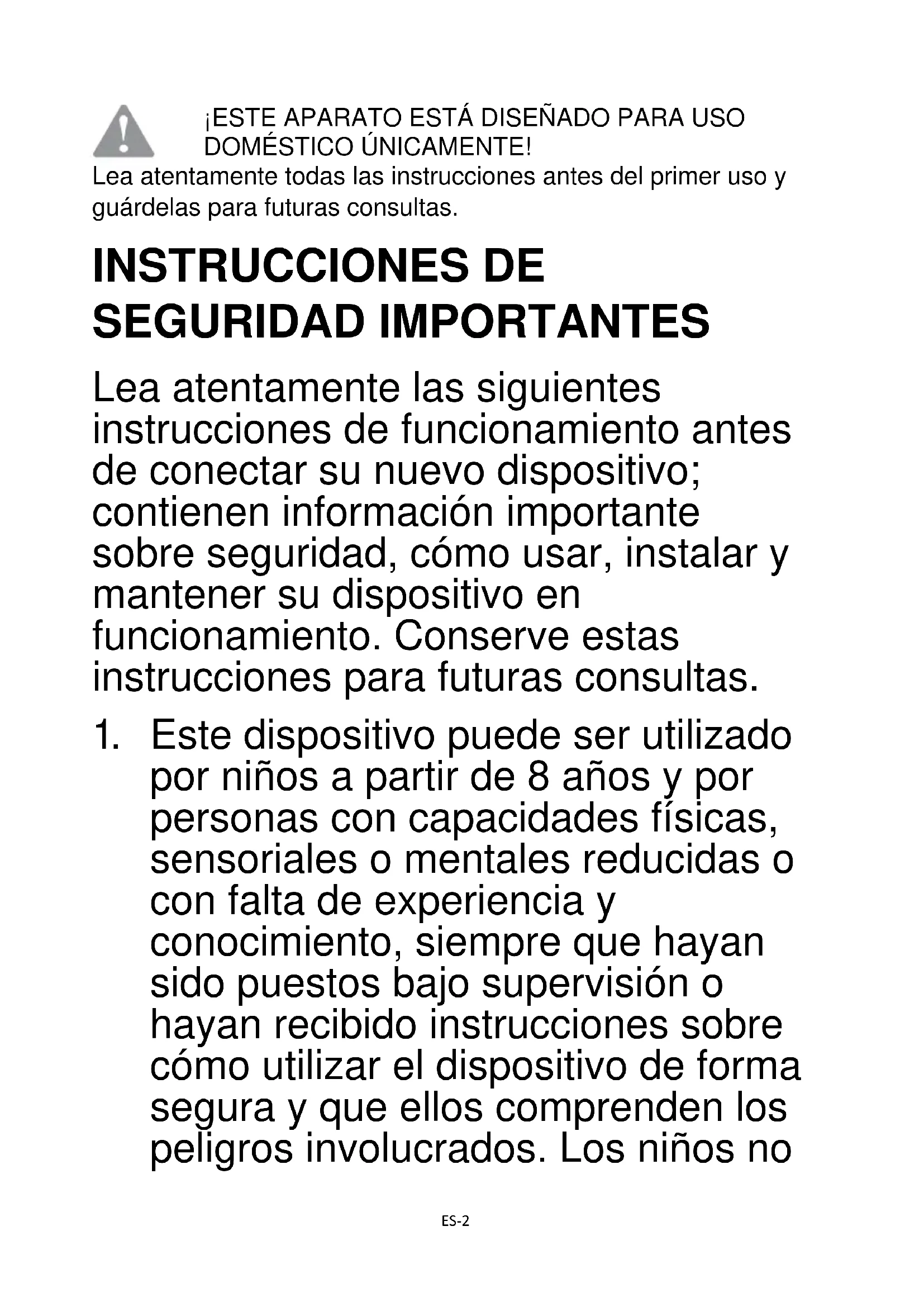 Este dispositivo puede ser utilizado por niños a partir de 8 años y por personas con capacidades físicas, sensoriales o mentales reducidas o con falta de experiencia y conocimiento, siempre que hayan sido puestos bajo supervisión o hayan recibido instrucciones sobre cómo utilizar el dispositivo de forma segura y que ellos comprenden los peligros involucrados. Los niños noES-3 deben jugar con el dispositivo. Los niños no deben realizar la limpieza y el mantenimiento del usuario sin supervisión.