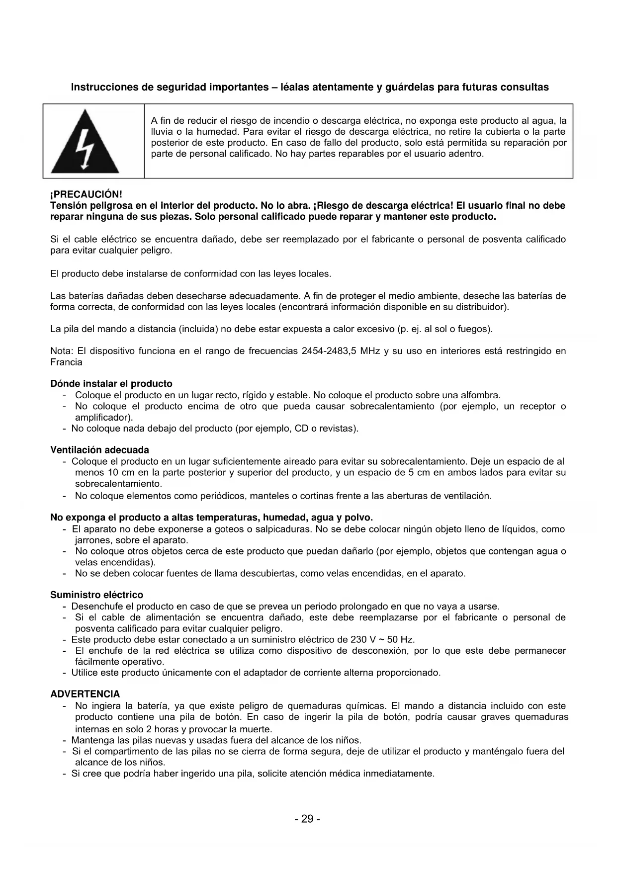 A fin de reducir el riesgo de incendio o descarga eléctrica, no exponga este producto al agua, la lluvia o la humedad. Para evitar el riesgo de descarga eléctrica, no retire la cubierta o la parte posterior de este producto. En caso de fallo del producto, solo está permitida su reparación por parte de personal calificado. No hay partes reparables por el usuario adentro. ¡PRECAUCIÓN! Tensión peligrosa en el interior del producto. No lo abra. ¡Riesgo de descarga eléctrica! El usuario final no debe reparar ninguna de sus piezas. Solo personal calificado puede reparar y mantener este producto. Si el cable eléctrico se encuentra dañado, debe ser reemplazado por el fabricante o personal de posventa calificado para evitar cualquier peligro. El producto debe instalarse de conformidad con las leyes locales. Las baterías dañadas deben desecharse adecuadamente. A fin de proteger el medio ambiente, deseche las baterías de forma correcta, de conformidad con las leyes locales (encontrará información disponible en su distribuidor). La pila del mando a distancia (incluida) no debe estar expuesta a calor excesivo (p. ej. al sol o fuegos). Nota: El dispositivo funciona en el rango de frecuencias 2454-2483,5 MHz y su uso en interiores está restringido en Francia Dónde instalar el producto - Coloque el producto en un lugar recto, rígido y estable. No coloque el producto sobre una alfombra. - No coloque el producto encima de otro que pueda causar sobrecalentamiento (por ejemplo, un receptor o amplificador). - No coloque nada debajo del producto (por ejemplo, CD o revistas). Ventilación adecuada - Coloque el producto en un lugar suficientemente aireado para evitar su sobrecalentamiento. Deje un espacio de al menos 10 cm en la parte posterior y superior del producto, y un espacio de 5 cm en ambos lados para evitar su sobrecalentamiento. - No coloque elementos como periódicos, manteles o cortinas frente a las aberturas de ventilación. No exponga el producto a altas temperaturas, humedad, agua y polvo. - El aparato no debe exponerse a goteos o salpicaduras. No se debe colocar ningún objeto lleno de líquidos, como jarrones, sobre el aparato. - No coloque otros objetos cerca de este producto que puedan dañarlo (por ejemplo, objetos que contengan agua o velas encendidas). - No se deben colocar fuentes de llama descubiertas, como velas encendidas, en el aparato. Suministro eléctrico - Desenchufe el producto en caso de que se prevea un periodo prolongado en que no vaya a usarse. - Si el cable de alimentación se encuentra dañado, este debe reemplazarse por el fabricante o personal de posventa calificado para evitar cualquier peligro. - Este producto debe estar conectado a un suministro eléctrico de 230 V ~ 50 Hz. - El enchufe de la red eléctrica se utiliza como dispositivo de desconexión, por lo que este debe permanecer fácilmente operativo. - Utilice este producto únicamente con el adaptador de corriente alterna proporcionado. ADVERTENCIA - No ingiera la batería, ya que existe peligro de quemaduras químicas. El mando a distancia incluido con este producto contiene una pila de botón. En caso de ingerir la pila de botón, podría causar graves quemaduras internas en solo 2 horas y provocar la muerte. - Mantenga las pilas nuevas y usadas fuera del alcance de los niños. - Si el compartimento de las pilas no se cierra de forma segura, deje de utilizar el producto y manténgalo fuera del alcance de los niños. - Si cree que podría haber ingerido una pila, solicite atención médica inmediatamente.- 30 - Declaración de conformidad de la UE Admea declara que su barra de sonido Bluetooth cumple los requisitos fundamentales y las demás disposiciones de la Directiva de equipos de radio 2014/53/UE. El texto completo de la declaración de conformidad de la UE está disponible en la siguiente dirección de Internet: http://www.schneiderconsumer.com