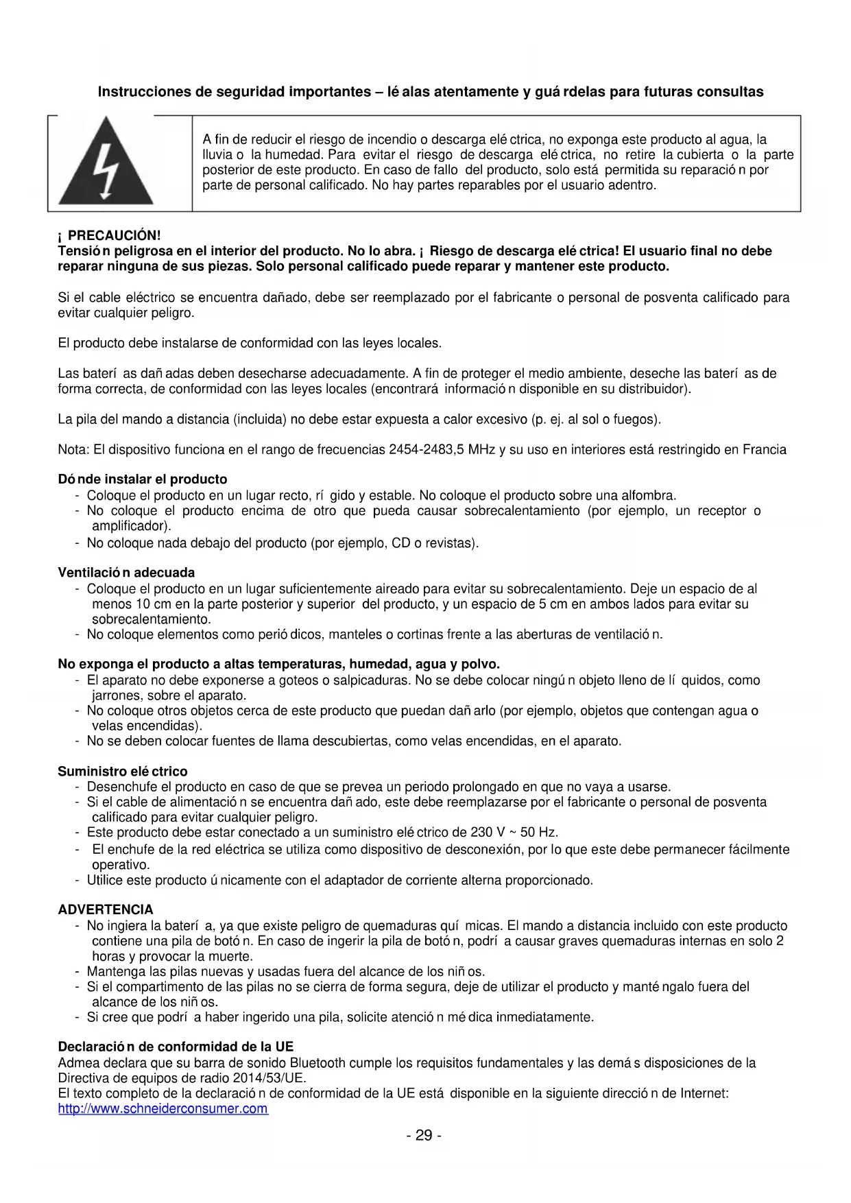 ¡PRECAUCIÓN! Tensión peligrosa en el interior del producto. No lo abra. ¡Riesgo de descarga eléctrica! El usuario final no debe reparar ninguna de sus piezas. Solo personal calificado puede reparar y mantener este producto. Si el cable eléctrico se encuentra dañado, debe ser reemplazado por el fabricante o personal de posventa calificado para evitar cualquier peligro. El producto debe instalarse de conformidad con las leyes locales. Las baterías dañadas deben desecharse adecuadamente. A fin de proteger el medio ambiente, deseche las baterías de forma correcta, de conformidad con las leyes locales (encontrará información disponible en su distribuidor). La pila del mando a distancia (incluida) no debe estar expuesta a calor excesivo (p. ej. al sol o fuegos). Nota: El dispositivo funciona en el rango de frecuencias 2454-2483,5 MHz y su uso en interiores está restringido en Francia Dónde instalar el producto - Coloque el producto en un lugar recto, rígido y estable. No coloque el producto sobre una alfombra. - No coloque el producto encima de otro que pueda causar sobrecalentamiento (por ejemplo, un receptor o amplificador). - No coloque nada debajo del producto (por ejemplo, CD o revistas). Ventilación adecuada - Coloque el producto en un lugar suficientemente aireado para evitar su sobrecalentamiento. Deje un espacio de al menos 10 cm en la parte posterior y superior del producto, y un espacio de 5 cm en ambos lados para evitar su sobrecalentamiento. - No coloque elementos como periódicos, manteles o cortinas frente a las aberturas de ventilación. No exponga el producto a altas temperaturas, humedad, agua y polvo. - El aparato no debe exponerse a goteos o salpicaduras. No se debe colocar ningún objeto lleno de líquidos, como jarrones, sobre el aparato. - No coloque otros objetos cerca de este producto que puedan dañarlo (por ejemplo, objetos que contengan agua o velas encendidas). - No se deben colocar fuentes de llama descubiertas, como velas encendidas, en el aparato. Suministro eléctrico - Desenchufe el producto en caso de que se prevea un periodo prolongado en que no vaya a usarse. - Si el cable de alimentación se encuentra dañado, este debe reemplazarse por el fabricante o personal de posventa calificado para evitar cualquier peligro. - Este producto debe estar conectado a un suministro eléctrico de 230 V ~ 50 Hz. - El enchufe de la red eléctrica se utiliza como dispositivo de desconexión, por lo que este debe permanecer fácilmente operativo. - Utilice este producto únicamente con el adaptador de corriente alterna proporcionado. ADVERTENCIA - No ingiera la batería, ya que existe peligro de quemaduras químicas. El mando a distancia incluido con este producto contiene una pila de botón. En caso de ingerir la pila de botón, podría causar graves quemaduras internas en solo 2 horas y provocar la muerte. - Mantenga las pilas nuevas y usadas fuera del alcance de los niños. - Si el compartimento de las pilas no se cierra de forma segura, deje de utilizar el producto y manténgalo fuera del alcance de los niños. - Si cree que podría haber ingerido una pila, solicite atención médica inmediatamente. Declaración de conformidad de la UE Admea declara que su barra de sonido Bluetooth cumple los requisitos fundamentales y las demás disposiciones de la Directiva de equipos de radio 2014/53/UE. El texto completo de la declaración de conformidad de la UE está disponible en la siguiente dirección de Internet: http://www.schneiderconsumer.com- 30 -