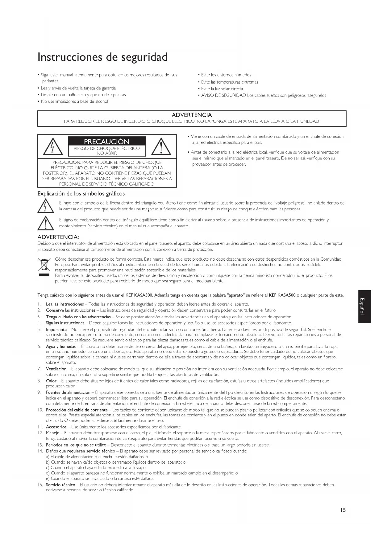 - AVISO DE SEGURIDAD Los cables sueltos son peligrosos, asegúrelos Tenga cuidado con lo siguiente antes de usar el KEF KASA500. Además tenga en cuenta que la palabra “aparato” se refiere al KEF KASA500 o cualquier parte de este.