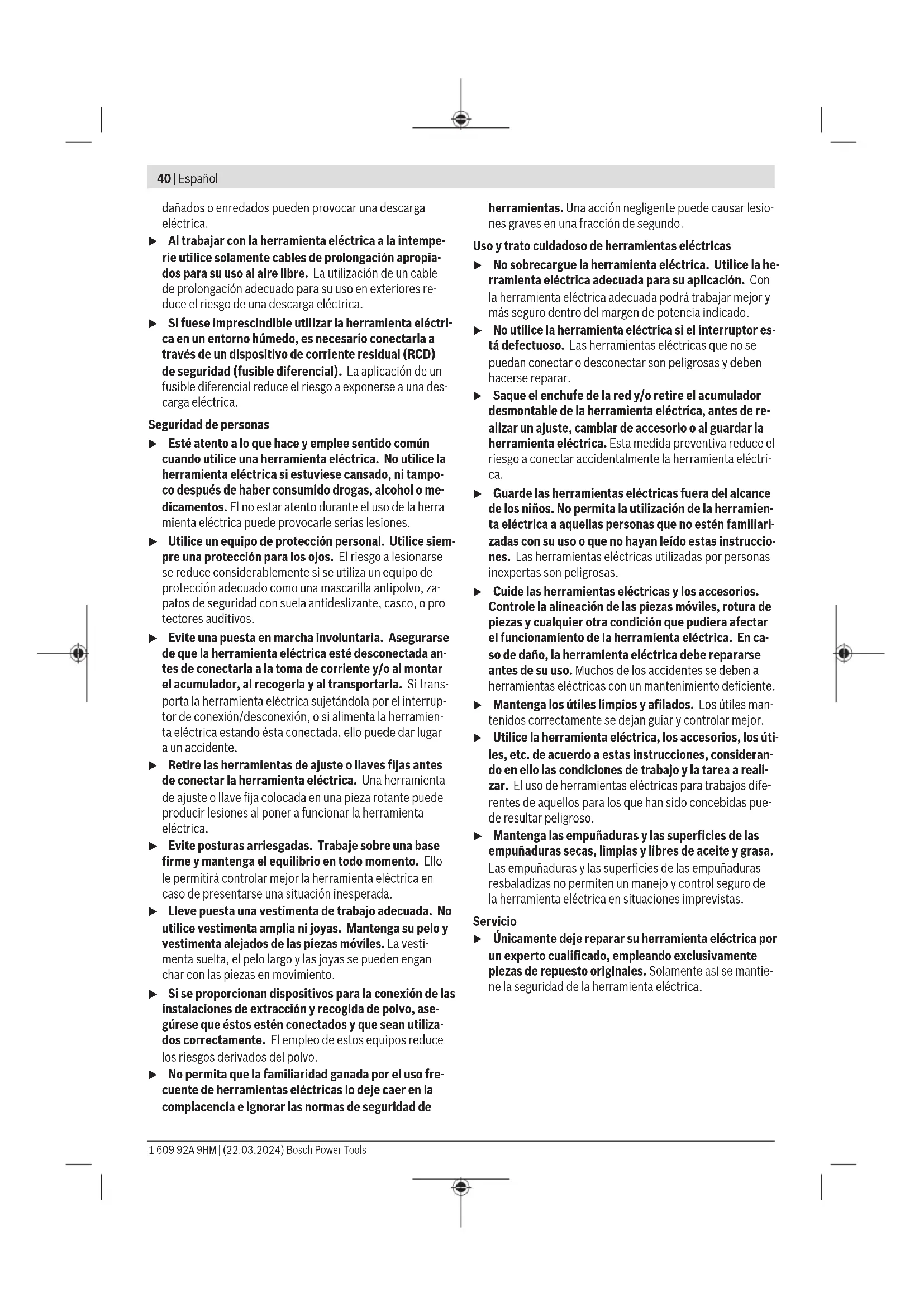 Interrupteur Marche/Arrêt avec blocage Pour mettre en marche l’outil électroportatif, appuyez d’abord sur l’interrupteur Marche/Arrêt(2) ➊ puis poussez- le vers l’avant ➋. Appuyez ensuite dessus et maintenez-le enfoncé ➌. Pour bloquer l’interrupteur Marche/Arrêt(2) en position en- foncée, poussez l’interrupteur Marche/Arrêt(2) encore plus vers l’avant ➍. Pour arrêter l’outil électroportatif, relâchez l’interrupteur Marche/Arrêt(2). S’il est bloqué, appuyez brièvement sur l’interrupteur Marche/Arrêt(2) puis relâchez-le. Interrupteur Marche/Arrêt sans blocage Pour mettre en marche l’outil électroportatif, appuyez d’abord sur l’interrupteur Marche/Arrêt(2) ➊ puis poussez- le vers l’avant ➋. Appuyez ensuite dessus et maintenez-le enfoncé ➌. Pour arrêter l’outil électroportatif, relâchez l’interrupteur Marche/Arrêt(2). u Vérifiez les accessoires de meulage avant de les utili- ser. L’accessoire de meulage doit être correctement monté et doit pouvoir tourner librement. Effectuez une marche d’essai en faisant tourner l’outil à vide pendant au moins 1 minute. N’utilisez jamais des ac- cessoires de meulage qui sont endommagés, qui vibrent ou dont la rotation est irrégulière. Les acces- soires de meulage endommagés peuvent éclater et causer des blessures. Entretien et Service après‑vente Nettoyage et entretien u Débranchez le câble d’alimentation de la prise avant d’effectuer des travaux quels qu’il soient sur l’outil électroportatif. u Tenez toujours propres l’outil électroportatif ainsi que les fentes de ventilation afin d’obtenir un travail im- peccable et sûr. u Dans la mesure du possible, utilisez toujours un aspi- rateur quand les conditions de travail sont extrêmes. Soufflez fréquemment de l’air comprimé au travers des fentes de ventilation et placez un disjoncteur dif- férentiel (PRCD) en amont. Lors du travail des métaux, il est possible que des poussières métalliques à effet conducteur se déposent à l’intérieur de l’outil. La double isolation de l’outil électroportatif risque alors d’être en- dommagée. Stockez et traitez les accessoires avec précaution. Dans le cas où il s’avère nécessaire de remplacer le câble d’alimentation, confiez le remplacement à Bosch ou une sta- tion de Service Après-Vente agréée pour outillage Bosch afin de ne pas compromettre la sécurité. Service après-vente et conseil utilisateurs Notre Service après-vente répond à vos questions concer- nant la réparation et l’entretien de votre produit et les pièces de rechange. Vous trouverez des vues éclatées et des infor- mations sur les pièces de rechange sur le site : www.bosch-pt.com L’équipe de conseil utilisateurs Bosch se tient à votre dispo- 1 609 92A 9HM | (22.03.2024) Bosch Power ToolsEspañol | 39 sition pour répondre à vos questions concernant nos pro- duits et leurs accessoires. Pour toute demande de renseignement ou toute commande de pièces de rechange, précisez impérativement la réfé- rence à 10chiffres figurant sur l’étiquette signalétique du produit. France Réparer un outil Bosch n’a jamais été aussi simple, et ce, en moins de 5 jours, grâce à SAV DIRECT, notre formulaire de retour en ligne que vous trouverez sur notre site internet www.bosch-pt.fr à la rubrique Services. Vous y trouverez également notre boutique de pièces détachées en ligne où vous pouvez passer directement vos commandes. Vous êtes un utilisateur, contactez : Le Service Clientèle Bosch Outillage Electroportatif Tel.: 0970821226 (Numéro non surtaxé au prix d'un ap- pel local) E-Mail: sav.outillage-electroportatif@fr.bosch.com Vous êtes un revendeur, contactez: Robert Bosch (France) S.A.S. Service Après-Vente Electroportatif 126, rue de Stalingrad 93705 DRANCY Cédex Tel.: (01) 43119006 E-Mail: sav-bosch.outillage@fr.bosch.com Vous trouverez d'autres adresses du service après-vente sous: www.bosch-pt.com/serviceaddresses Élimination des déchets Les outils électroportatifs, ainsi que leurs accessoires et em- ballages, doivent pouvoir suivre chacun une voie de recy- clage appropriée. Ne jetez pas les outils électroportatifs avec les ordures ménagères! Seulement pour les pays de l’UE : Conformément à la directive européenne 2012/19/UE rela- tive aux déchets d’équipements électriques et électroniques et sa mise en vigueur conformément aux législations natio- nales, les outils électroportatifs dont on ne peut plus se ser- vir doivent être isolés et suivre une voie de recyclage appro- priée. En cas de non-respect des consignes d’élimination, les dé- chets d’équipements électriques et électroniques peuvent avoir un impact négatif sur l’environnement et la santé des personnes du fait des substances dangereuses qu’ils contiennent. Valable uniquement pour la France: Español Indicaciones de seguridad Indicaciones generales de seguridad para herramientas eléctricas ADVERTEN- CIA Lea íntegramente las advertencias de peligro, las instrucciones, las ilustraciones y las especificacio- nes entregadas con esta herramienta eléctrica. En caso de no atenerse a las instrucciones siguientes, ello puede ocasionar una descarga eléctrica, un incendio y/o una lesión grave. Guardar todas las advertencias de peligro e instruccio- nes para futuras consultas. El término "herramienta eléctrica" empleado en las siguien- tes advertencias de peligro se refiere a herramientas eléctri- cas de conexión a la red (con cable de red) y a herramientas eléctricas accionadas por acumulador (sin cable de red). Seguridad del puesto de trabajo u Mantenga el área de trabajo limpia y bien iluminada. Las áreas desordenadas u oscuras pueden provocar acci- dentes. u No utilice herramientas eléctricas en un entorno con peligro de explosión, en el que se encuentren combus- tibles líquidos, gases o material en polvo. Las herra- mientas eléctricas produ