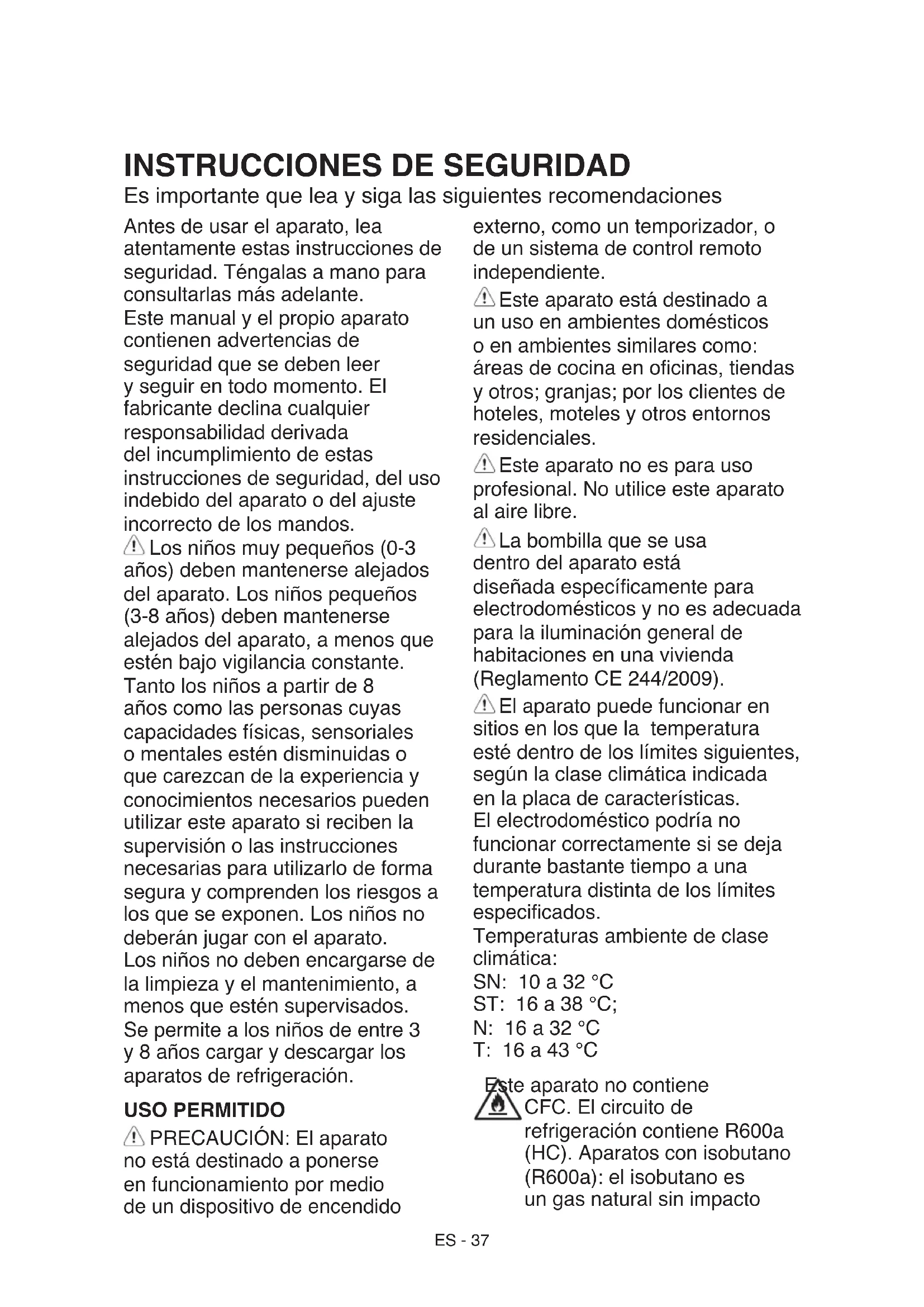 Es importante que lea y siga las siguientes recomendaciones Antes de usar el aparato, lea atentamente estas instrucciones de seguridad. Téngalas a mano para consultarlas más adelante. Este manual y el propio aparato contienen advertencias de seguridad que se deben leer y seguir en todo momento. El fabricante declina cualquier responsabilidad derivada del incumplimiento de estas instrucciones de seguridad, del uso indebido del aparato o del ajuste incorrecto de los mandos. Los niños muy pequeños (0-3 años) deben mantenerse alejados del aparato. Los niños pequeños (3-8 años) deben mantenerse alejados del aparato, a menos que estén bajo vigilancia constante. Tanto los niños a partir de 8 años como las personas cuyas capacidades físicas, sensoriales o mentales estén disminuidas o que carezcan de la experiencia y conocimientos necesarios pueden utilizar este aparato si reciben la supervisión o las instrucciones necesarias para utilizarlo de forma segura y comprenden los riesgos a los que se exponen. Los niños no deberán jugar con el aparato. Los niños no deben encargarse de la limpieza y el mantenimiento, a menos que estén supervisados. Se permite a los niños de entre 3 y 8 años cargar y descargar los aparatos de refrigeración. USO PERMITIDO PRECAUCIÓN: El aparato no está destinado a ponerse en funcionamiento por medio de un dispositivo de encendido externo, como un temporizador, o de un sistema de control remoto independiente. Este aparato está destinado a un uso en ambientes domésticos o en ambientes similares como: áreas de cocina en ocinas, tiendas y otros; granjas; por los clientes de hoteles, moteles y otros entornos residenciales. Este aparato no es para uso profesional. No utilice este aparato al aire libre. La bombilla que se usa dentro del aparato está diseñada especícamente para electrodomésticos y no es adecuada para la iluminación general de habitaciones en una vivienda (Reglamento CE 244/2009). El aparato puede funcionar en sitios en los que la temperatura esté dentro de los límites siguientes, según la clase climática indicada en la placa de características. El electrodoméstico podría no funcionar correctamente si se deja durante bastante tiempo a una temperatura distinta de los límites especicados. Temperaturas ambiente de clase climática: SN: 10 a 32 °C ST: 16 a 38 °C; N: 16 a 32 °C T: 16 a 43 °C Este aparato no contiene CFC. El circuito de refrigeración contiene R600a (HC). Aparatos con isobutano (R600a): el isobutano es un gas natural sin impactoES - 38 medioambiental, pero que resulta inamable. Por este motivo, compruebe que las tuberías del circuito de refrigeración no estén dañadas, especialmente cuando vacíe el circuito de refrigeración. ADVERTENCIA: No dañe las tuberías del circuito de refrigeración del electrodoméstico. ADVERTENCIA: Mantenga despejadas los oricios de ventilación del aparato o la estructura. ADVERTENCIA: No use medios mecánicos, eléctricos o químicos, excepto los indicados por el fabricante, para acelerar el proceso de descongelación. ADVERTENCIA: No use ni coloque dispositivos eléctricos dentro de los compartimentos del aparato, salvo que se trate de aquellos autorizados expresamente por el fabricante. ADVERTENCIA: Las máquinas de hielo o los dispensadores de agua que no estén conectados directamente a la toma de agua deben llenarse solamente con agua potable. ADVERTENCIA: Los productores automáticos de hielo y los dispensadores de agua deben estar conectados a una toma de agua que solo suministre agua potable con una presión del agua comprendida entre 0,17 y 0,81 MPa (1,7 y 8,1 bar). No almacene sustancias explosivas, como aerosoles, ni coloque ni utilice gasolina u otros materiales inamables encima o cerca del aparato. No ingiera el contenido (no es tóxico) de los acumuladores de hielo (suministrado con algunos modelos). No coma cubitos de hielo ni polos inmediatamente después de sacarlos del congelador, ya que pueden provocar quemaduras por frío. Para los productos diseñados para funcionar con un ltro de aire integrados en una cubierta del ventilador accesible, el ltro debe estar siempre bien colocado si el frigoríco está en funcionamiento. No guarde recipientes de cristal con líquidos en el compartimento del congelador ya que podrían romperse. No obstruya el ventilador (si se incluye) con los alimentos. Después de colocar los alimentos compruebe que las puertas de los compartimentos cierran correctamente, especialmente la puerta del congelador. Las juntas dañadas deben sustituirse lo antes posible. Utilice el compartimento frigoríco solamente para conservar alimentos frescos y el compartimento del congelador solamente para conservar alimentos congelados, congelar alimentos frescos y hacer cubitos de hielo. Envuelva los alimentos para guardarlos; de este modo se evita que entren en contacto directo con las supercies interiores de los compartimentos del frigoríco o del congelador. Los aparatos podrían incluir compartimentos especiales (compartimento de alimentos frescos, compartimento de cero grados,...). Si no se especica lo contrario enES - 39 el folleto especíco del producto pueden retirarse, manteniendo rendimientos equivalentes. El pentano C se utiliza como agente expansor en la espuma aislante y es un gas inamable. Estos son los compartimentos más apropiados del aparato en los que conservar los alimentos teniendo en cuenta la distinta distribución de temperatura en cada compartimento del aparato: