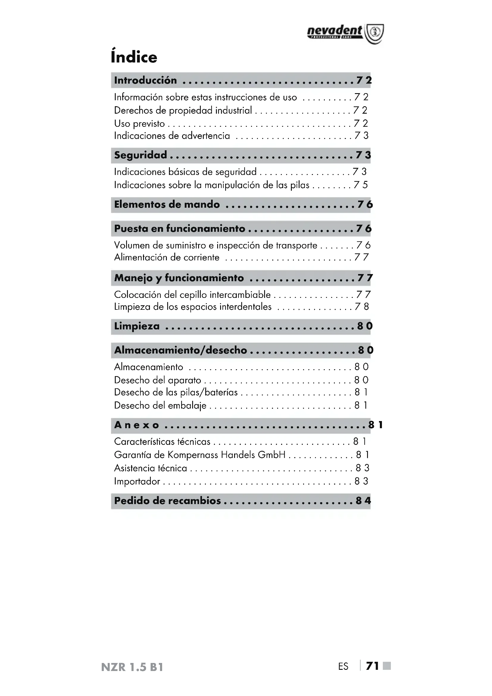 ES Introducción Información sobre estas instrucciones de uso Felicidades por la compra de su aparato nuevo. Ha adquirido un producto de alta calidad. Las instrucciones de uso forman parte del producto y contienen indicaciones importantes acerca de la seguridad, el uso y el desecho de este aparato. Antes de usar el producto, familiarícese con todas las indicaciones de manejo y de seguridad. Utilice el producto únicamente como se describe y para los ámbitos de aplicación indicados. Entregue todos los documentos, incluidas estas instrucciones de uso, cuando transfiera o venda el producto a terceros. Derechos de propiedad industrial Esta documentación está protegida por derechos de propiedad industrial. Solo se permite su reproducción o reimpresión, total o parcial, así como la reproducción de imágenes, incluso modificadas, con la autorización por escrito del fabricante. Uso previsto Este aparato está previsto para la limpieza de los espacios interdentales. Cualquier uso diferente o que supere lo indicado se considerará contrario al uso previsto. El aparato no está previsto para su uso comercial o industrial. Se excluyen las reclamaciones de cualquier tipo a causa de daños producidos por un uso contrario a lo dispuesto, repara- ciones incorrectas, modificaciones no autorizadas o el uso de piezas de repuesto no autorizadas. El riesgo será responsabilidad exclusiva del usuario.NZR 1.5 B1 ES