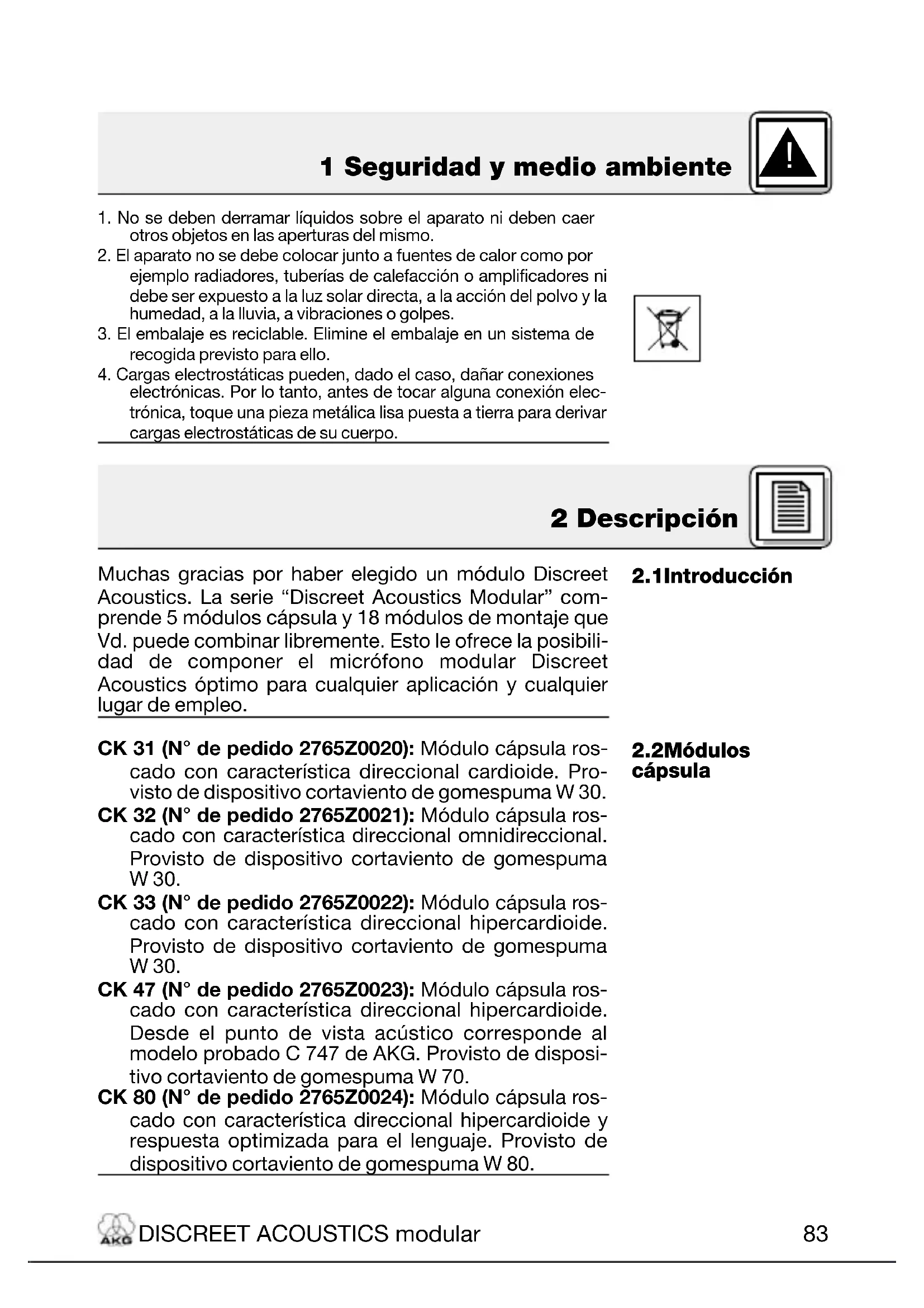 cápsula Muchas gracias por haber elegido un módulo Discreet Acoustics. La serie “Discreet Acoustics Modular” com- prende 5 módulos cápsula y 18 módulos de montaje que Vd. puede combinar libremente. Esto le ofrece la posibili- dad de componer el micrófono modular Discreet Acoustics óptimo para cualquier aplicación y cualquier lugar de empleo. CK 31 (N° de pedido 2765Z0020): Módulo cápsula ros- cado con característica direccional cardioide. Pro- visto de dispositivo cortaviento de gomespuma W 30. CK 32 (N° de pedido 2765Z0021): Módulo cápsula ros- cado con característica direccional omnidireccional. Provisto de dispositivo cortaviento de gomespuma W 30. CK 33 (N° de pedido 2765Z0022): Módulo cápsula ros- cado con característica direccional hipercardioide. Provisto de dispositivo cortaviento de gomespuma W 30. CK 47 (N° de pedido 2765Z0023): Módulo cápsula ros- cado con característica direccional hipercardioide. Desde el punto de vista acústico corresponde al modelo probado C 747 de AKG. Provisto de disposi- tivo cortaviento de gomespuma W 70. CK 80 (N° de pedido 2765Z0024): Módulo cápsula ros- cado con característica direccional hipercardioide y respuesta optimizada para el lenguaje. Provisto de dispositivo cortaviento de gomespuma W 80. DISCREET ACOUSTICS modular 1 Seguridad y medio ambiente 1. No se deben derramar líquidos sobre el aparato ni deben caerotros objetos en las aperturas del mismo.2. El aparato no se debe colocar junto a fuentes de calor como porejemplo radiadores, tuberías de calefacción o amplificadores nidebe ser expuesto a la luz solar directa, a la acción del polvo y lahumedad, a la lluvia, a vibraciones o golpes.3. El embalaje es reciclable. Elimine el embalaje en un sistema derecogida previsto para ello.4. Cargas electrostáticas pueden, dado el caso, dañar conexioneselectrónicas. Por lo tanto, antes de tocar alguna conexión elec-trónica, toque una pieza metálica lisa puesta a tierra para derivarcargas electrostáticas de su cuerpo. 2 Descripción