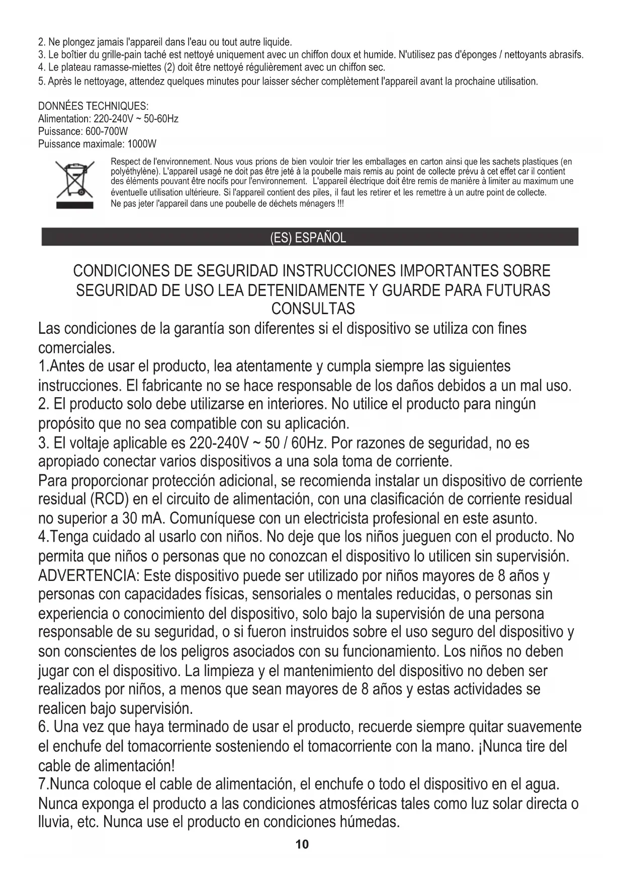 DATOS TÉCNICOS: Fuente de alimentación: 220-240V ~ 50-60Hz Poder: 600-700W Potencia máxima: 1000 W Preocupación por el medio ambiente. Por favor, lleva las cajas de cartón a un sitio de reciclaje. Las bolsas de polietileno se deben tirar al cubo de la basura amarillo (para envases). El equipo gastado debe ser entregado en el punto de almacenamiento adecuado, porque las piezas que constituyen el equipo pueden suponer un peligro para el medio ambiente. Debes entregar el equipo Hay que devolver el equipo eléctrico con el fin de evitar su reutilización. Si en el equipo se encuentran pilas, hay que sacarlas y entregar por separado, en un punto de almacenamiento adecuado. No tires el equipo al contenedor para residuos urbanos!! CONDIÇÕES DE SEGURANÇA INSTRUÇÕES IMPORTANTES SOBRE SEGURANÇA DE USO, LEIA COM ATENÇÃO E MANTENHA PARA REFERÊNCIA FUTURA As condições de garantia são diferentes, se o dispositivo for usado para fins comerciais. 1.Antes de usar o produto, leia com atenção e sempre siga as instruções a seguir. O fabricante não é responsável por quaisquer danos devido a qualquer uso indevido.
