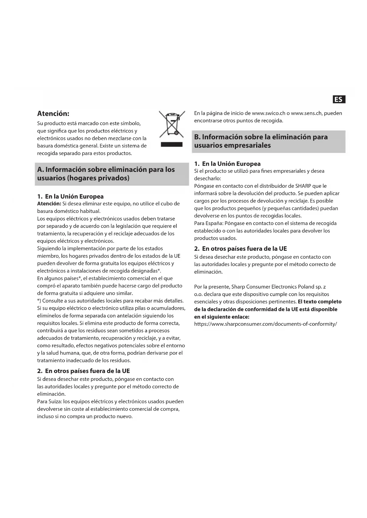Si el producto se utilizó para nes empresariales y desea desecharlo: Póngase en contacto con el distribuidor de SHARP que le informará sobre la devolución del producto. Se pueden aplicar cargos por los procesos de devolución y reciclaje. Es posible que los productos pequeños (y pequeñas cantidades) puedan devolverse en los puntos de recogidas locales. Para España: Póngase en contacto con el sistema de recogida establecido o con las autoridades locales para devolver los productos usados.