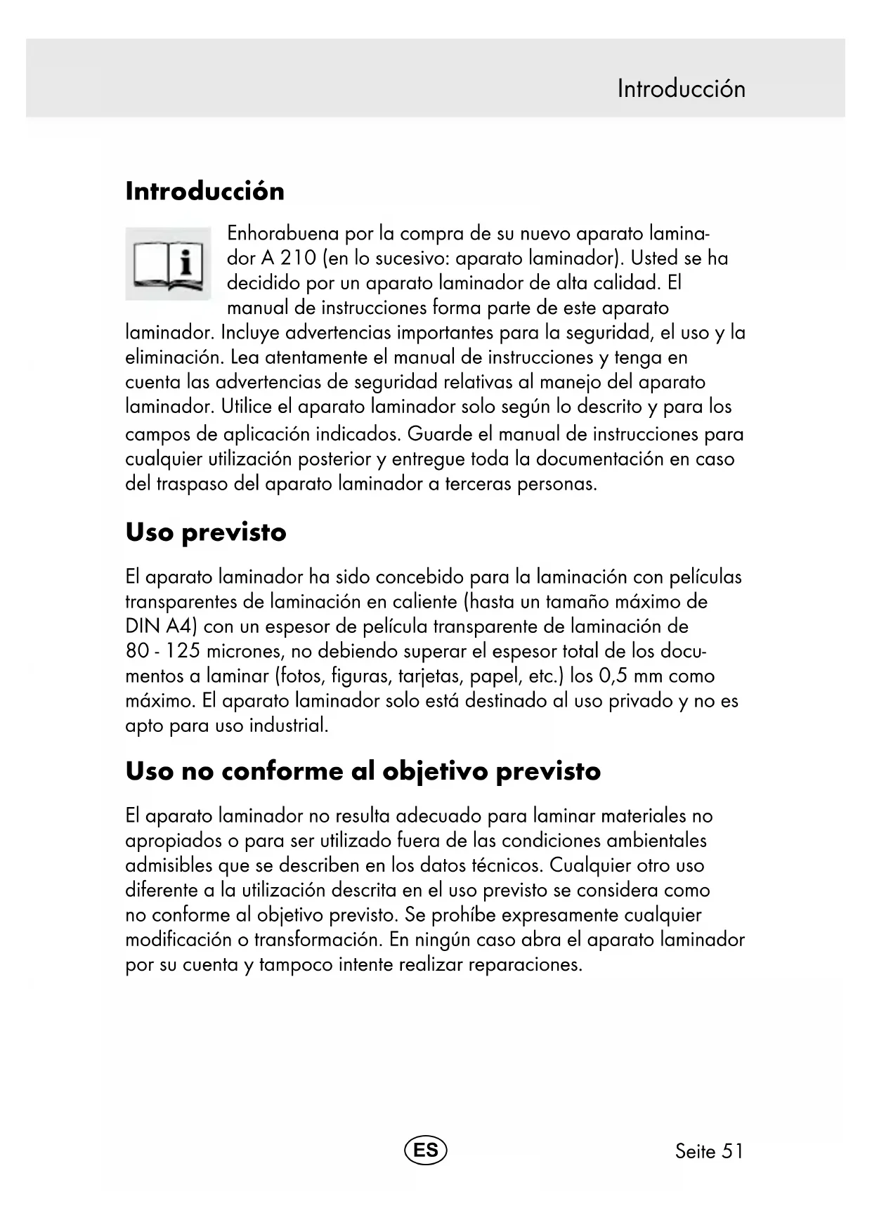 - Garantía Seite 51 Introducción Introducción Enhorabuena por la compra de su nuevo aparato lamina- dor A 210 (en lo sucesivo: aparato laminador). Usted se ha decidido por un aparato laminador de alta calidad. El manual de instrucciones forma parte de este aparato laminador. Incluye advertencias importantes para la seguridad, el uso y la eliminación. Lea atentamente el manual de instrucciones y tenga en cuenta las advertencias de seguridad relativas al manejo del aparato laminador. Utilice el aparato laminador solo según lo descrito y para los campos de aplicación indicados. Guarde el manual de instrucciones para cualquier utilización posterior y entregue toda la documentación en caso del traspaso del aparato laminador a terceras personas. Uso previsto El aparato laminador ha sido concebido para la laminación con películas transparentes de laminación en caliente (hasta un tamaño máximo de DIN A4) con un espesor de película transparente de laminación de p. 61