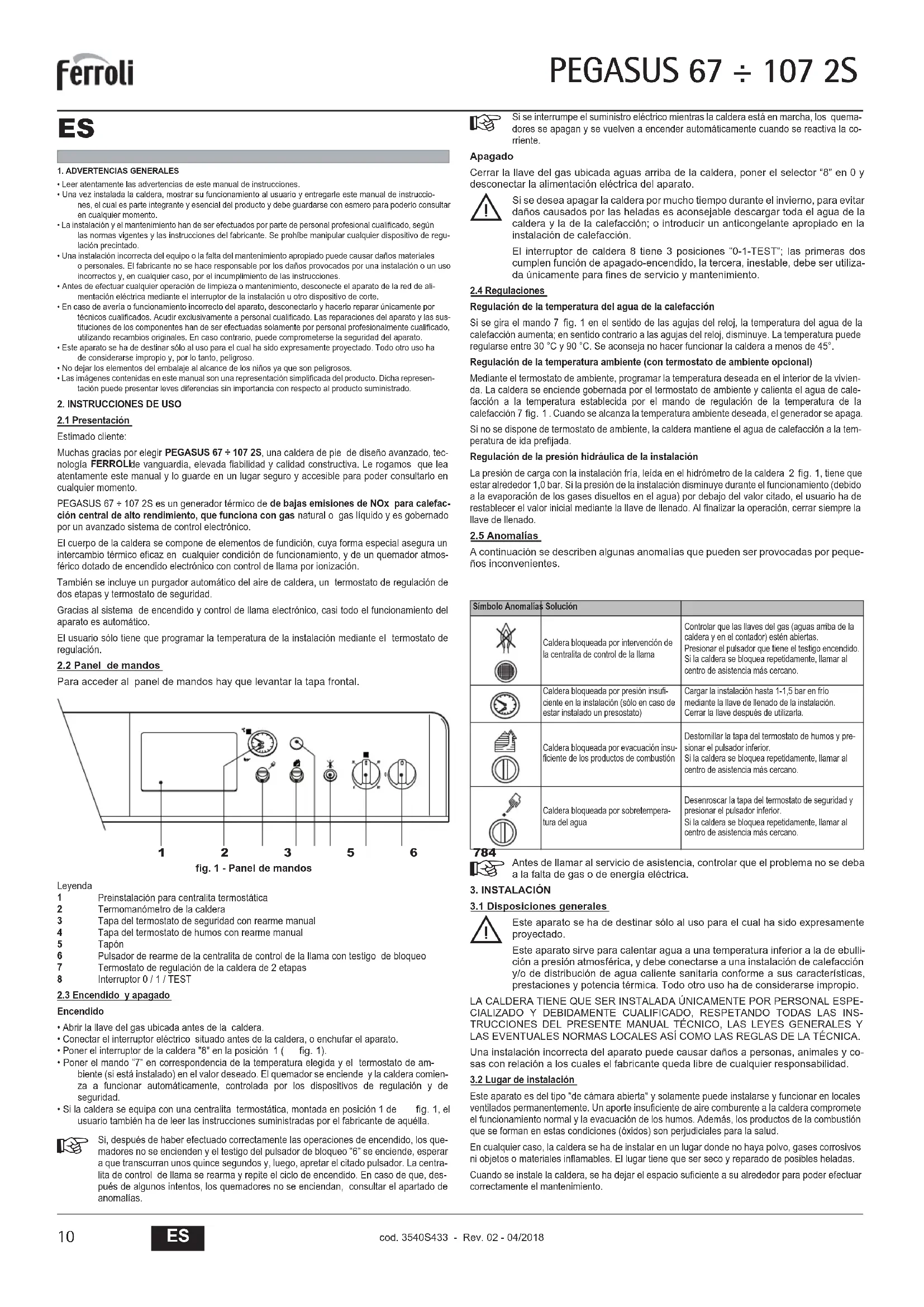 1. ADVERTENCIAS GENERALES• Leer atentamente las advertencias de este manual de instrucciones.• Una vez instalada la caldera, mostrar su funcionamiento al usuario y entregarle este manual de instruccio-nes, el cual es parte integrante y esencial del producto y debe guardarse con esmero para poderlo consultaren cualquier momento.• La instalación y el mantenimiento han de ser efectuados por parte de personal profesional cualificado, segúnlas normas vigentes y las instrucciones del fabricante. Se prohíbe manipular cualquier dispositivo de regu-lación precintado.• Una instalación incorrecta del equipo o la falta del mantenimiento apropiado puede causar daños materialeso personales. El fabricante no se hace responsable por los daños provocados por una instalación o un usoincorrectos y, en cualquier caso, por el incumplimiento de las instrucciones.• Antes de efectuar cualquier operación de limpieza o mantenimiento, desconecte el aparato de la red de ali-mentación eléctrica mediante el interruptor de la instalación u otro dispositivo de corte.• En caso de avería o funcionamiento incorrecto del aparato, desconectarlo y hacerlo reparar únicamente portécnicos cualificados. Acudir exclusivamente a personal cualificado. Las reparaciones del aparato y las sus-tituciones de los componentes han de ser efectuadas solamente por personal profesionalmente cualificado,utilizando recambios originales. En caso contrario, puede comprometerse la seguridad del aparato.• Este aparato se ha de destinar sólo al uso para el cual ha sido expresamente proyectado. Todo otro uso hade considerarse impropio y, por lo tanto, peligroso.• No dejar los elementos del embalaje al alcance de los niños ya que son peligrosos.• Las imágenes contenidas en este manual son una representación simplificada del producto. Dicha represen-tación puede presentar leves diferencias sin importancia con respecto al producto suministrado.2. INSTRUCCIONES DE USO2.1 PresentaciónEstimado cliente:Muchas gracias por elegir PEGASUS 67 ÷ 107 2S, una caldera de pie de diseño avanzado, tec-nología FERROLIde vanguardia, elevada fiabilidad y calidad constructiva. Le rogamos que leaatentamente este manual y lo guarde en un lugar seguro y accesible para poder consultarlo encualquier momento.PEGASUS 67 ÷ 107 2S es un generador térmico de de bajas emisiones de NOx para calefac-ción central de alto rendimiento, que funciona con gas natural o gas líquido y es gobernadopor un avanzado sistema de control electrónico.El cuerpo de la caldera se compone de elementos de fundición, cuya forma especial asegura unintercambio térmico eficaz en cualquier condición de funcionamiento, y de un quemador atmos-férico dotado de encendido electrónico con control de llama por ionización.También se incluye un purgador automático del aire de caldera, un termostato de regulación dedos etapas y termostato de seguridad.Gracias al sistema de encendido y control de llama electrónico, casi todo el funcionamiento delaparato es automático.El usuario sólo tiene que programar la temperatura de la instalación mediante el termostato deregulación.2.2 Panel de mandosPara acceder al panel de mandos hay que levantar la tapa frontal.fig. 1 - Panel de mandosLeyenda Preinstalación para centralita termostática Termomanómetro de la caldera Tapa del termostato de seguridad con rearme manual Tapa del termostato de humos con rearme manual Tapón Pulsador de rearme de la centralita de control de la llama con testigo de bloqueo Termostato de regulación de la caldera de 2 etapas Interruptor 0 / 1 / TEST2.3 Encendido y apagadoEncendido• Abrir la llave del gas ubicada antes de la caldera.• Conectar el interruptor eléctrico situado antes de la caldera, o enchufar el aparato.• Poner el interruptor de la caldera "8" en la posición 1 (fig. 1
