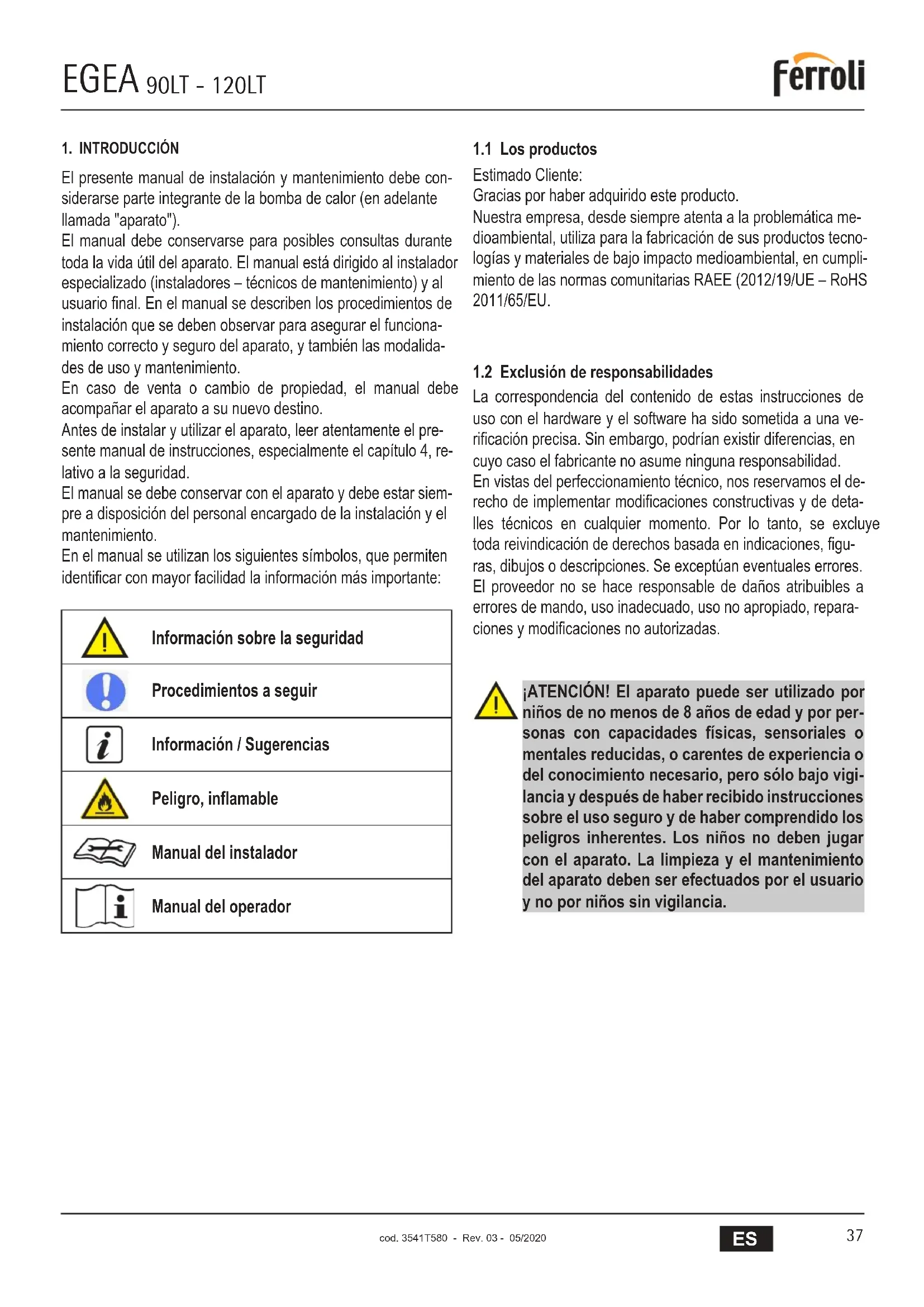 La correspondencia del contenido de estas instrucciones de uso con el hardware y el software ha sido sometida a una ve- rificación precisa. Sin embargo, podrían existir diferencias, en cuyo caso el fabricante no asume ninguna responsabilidad. En vistas del perfeccionamiento técnico, nos reservamos el de- recho de implementar modificaciones constructivas y de deta- lles técnicos en cualquier momento. Por lo tanto, se excluye toda reivindicación de derechos basada en indicaciones, figu- ras, dibujos o descripciones. Se exceptúan eventuales errores. El proveedor no se hace responsable de daños atribuibles a errores de mando, uso inadecuado, uso no apropiado, repara- ciones y modificaciones no autorizadas. ¡ATENCIÓN! El aparato puede ser utilizado por niños de no menos de 8 años de edad y por per- sonas con capacidades físicas, sensoriales o mentales reducidas, o carentes de experiencia o del conocimiento necesario, pero sólo bajo vigi- lancia y después de haber recibido instrucciones sobre el uso seguro y de haber comprendido los peligros inherentes. Los niños no deben jugar con el aparato. La limpieza y el mantenimiento del aparato deben ser efectuados por el usuario y no por niños sin vigilancia.EGEA 90LT - 120LT cod. 3541T580 - Rev. 03 - 05/2020
