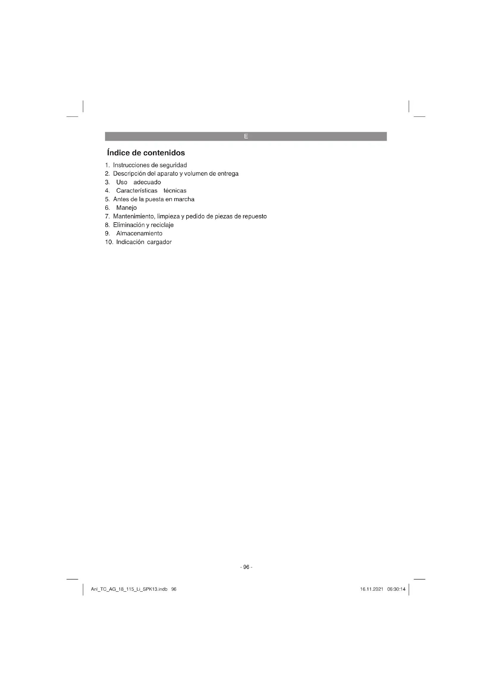 Guardar el aparato y sus accesorios en un lugar oscuro, seco, protegido de las heladas e inaccesible para los niños. La temperatura de almacenamiento óptima se encuentra entre los 5 y 30 ˚C. Guardar la herramienta eléctrica en su embalaje original. Anl_TC_AG_18_115_Li_SPK13.indb 102Anl_TC_AG_18_115_Li_SPK13.indb 102 16.11.2021 06:30:1516.11.2021 06:30:15E