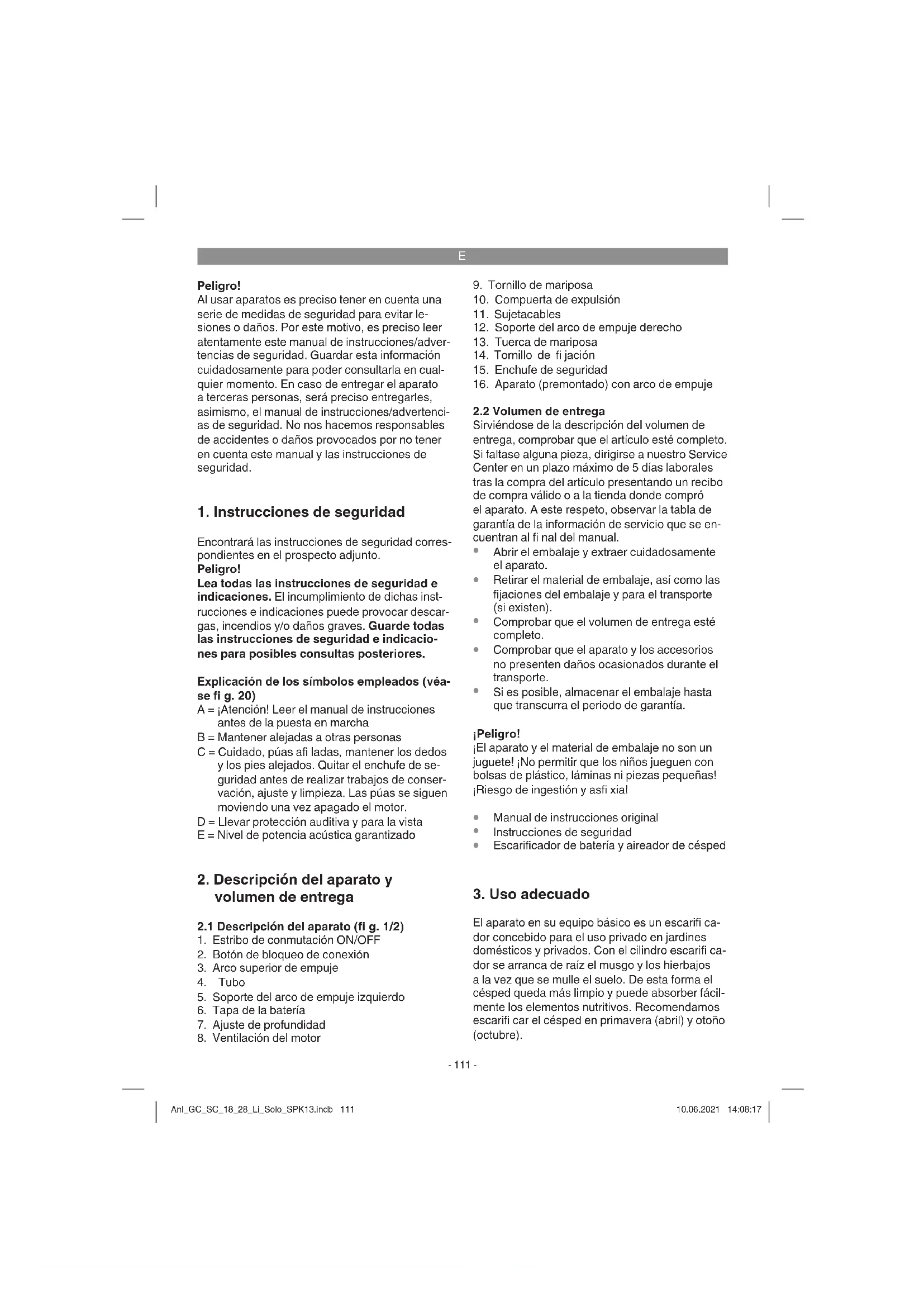 ¡Cuidado! El escarifi cador está provisto de un interruptor de seguridad para evitar que se use indebidamente. Justo antes de la puesta en marcha del escarifi - cador, es preciso poner el enchufe de seguridad (fi g. 13/pos. 15) y quitarlo cada vez que se inter- rumpan o fi nalicen los trabajos. Anl_GC_SC_18_28_Li_Solo_SPK13.indb 114Anl_GC_SC_18_28_Li_Solo_SPK13.indb 114 10.06.2021 14:08:1810.06.2021 14:08:18E