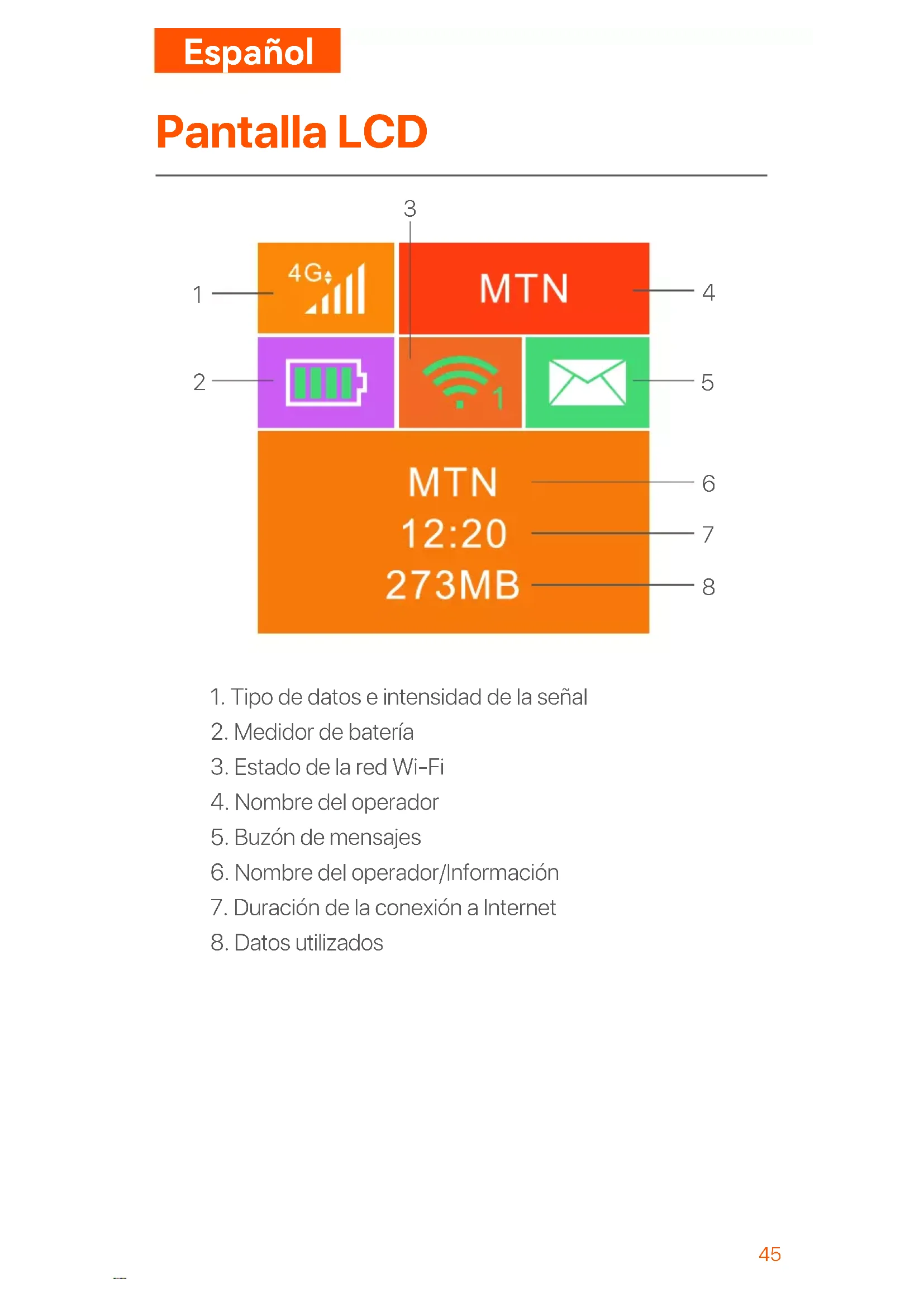 Enciende el Router 4G185 Tipo de datos e intensidad de señal Mantén pulsado el botón hasta que la pantalla LCD se ilumine. Cuando el dispositivo cuente con conexión a Internet, encontrarás los siguientes iconos: Si el dispositivo no se conecta a Internet pasados varios minutos, consulta el Q1 del FAQ. ConsejosEspañol