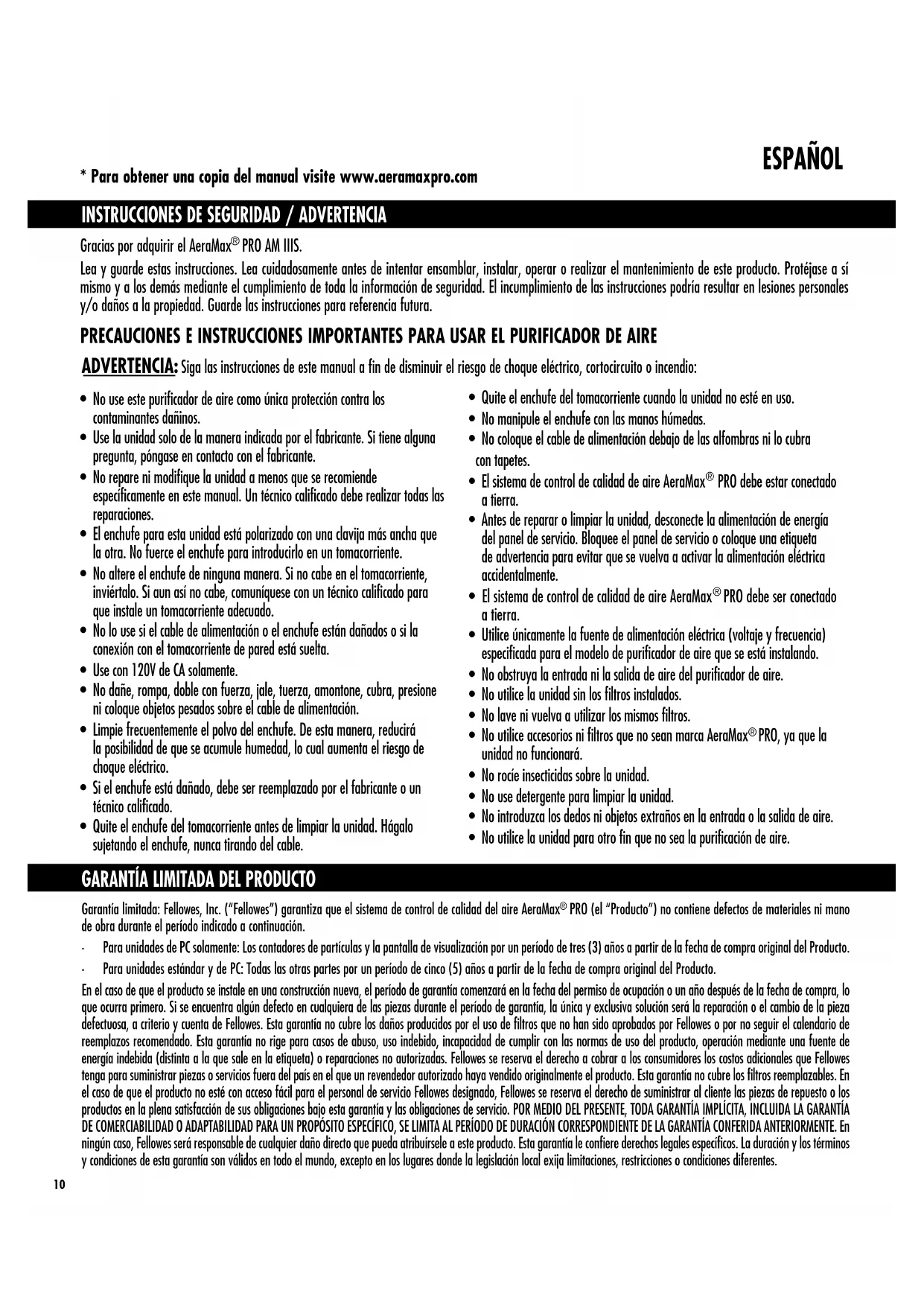 - Para obtener una copia del manual visite www.aeramaxpro.com Garantía limitada: Fellowes, Inc. (“Fellowes”) garantiza que el sistema de control de calidad del aire AeraMax PRO (el “Producto”) no contiene defectos de materiales ni mano de obra durante el período indicado a continuación.