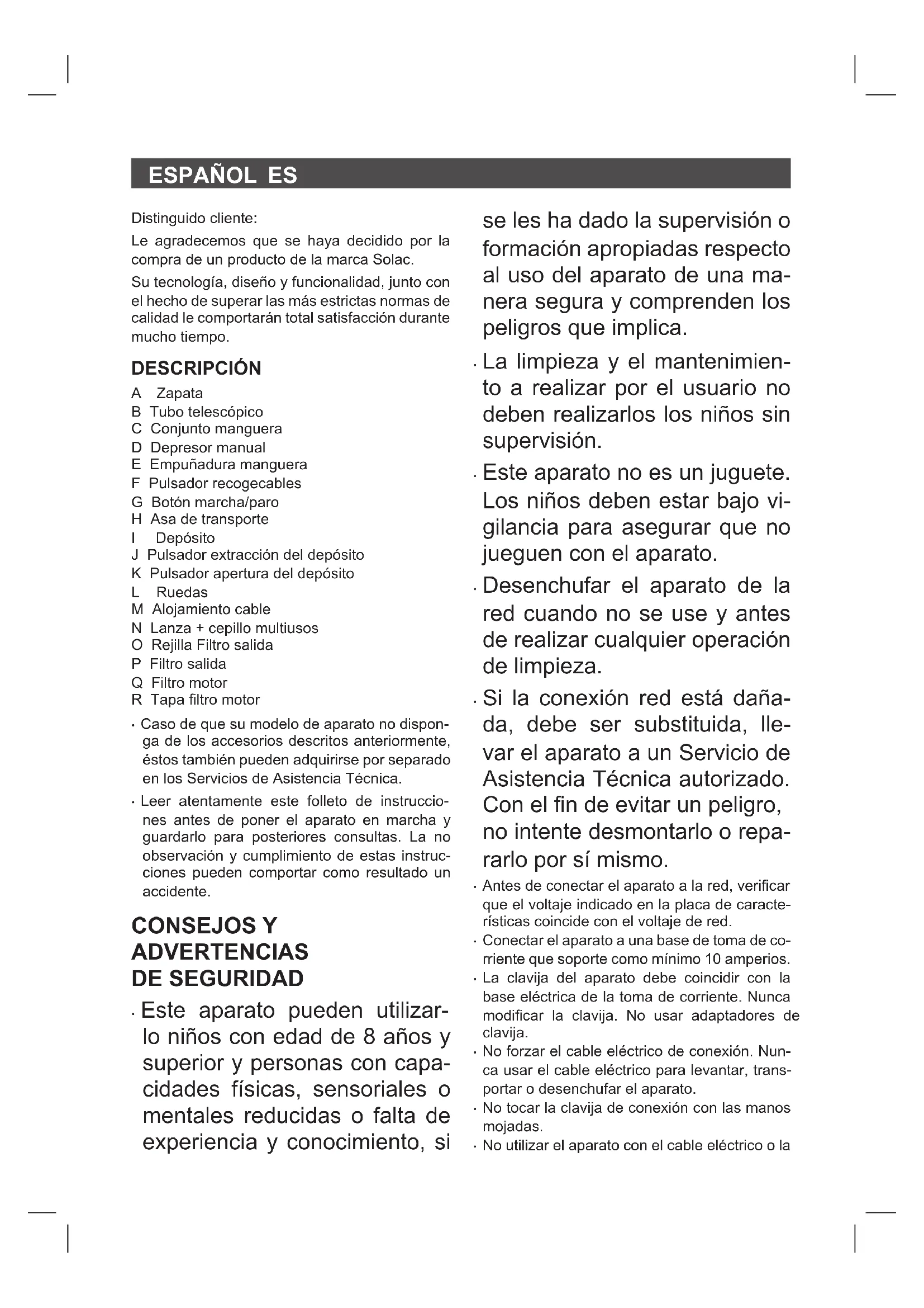 Distinguido cliente: Le agradecemos que se haya decidido por la compra de un producto de la marca Solac. Su tecnología, diseño y funcionalidad, junto con el hecho de superar las más estrictas normas de calidad le comportarán total satisfacción durante mucho tiempo. DESCRIPCIÓN A Zapata B Tubo telescópico C Conjunto manguera D Depresor manual E Empuñadura manguera F Pulsador recogecables G Botón marcha/paro H Asa de transporte I Depósito J Pulsador extracción del depósito K Pulsador apertura del depósito L Ruedas M Alojamiento cable N Lanza + cepillo multiusos O Rejilla Filtro salida P Filtro salida Q Filtro motor R Tapa ltro motor