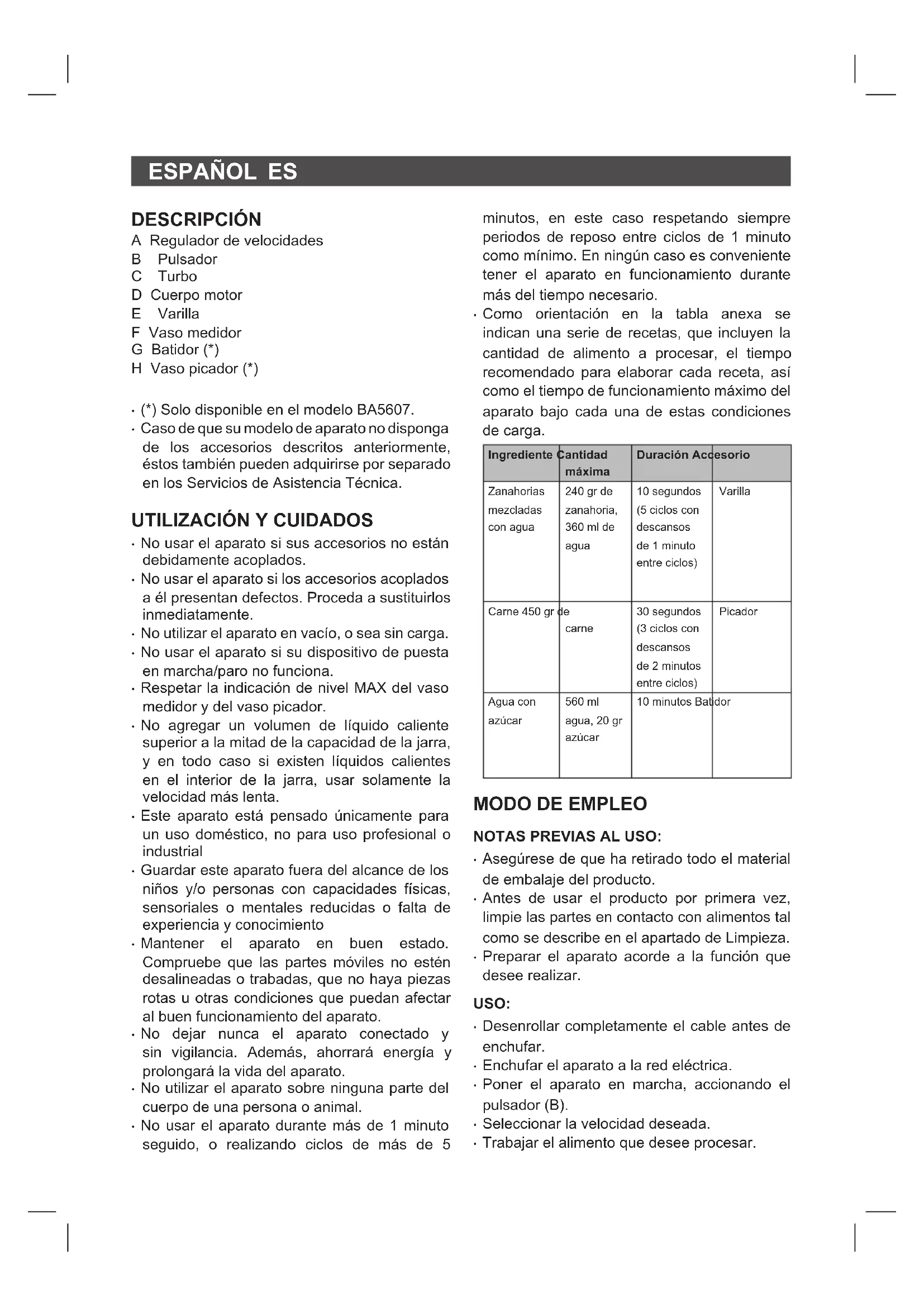 - Como orientación en la tabla anexa se indican una serie de recetas, que incluyen la cantidad de alimento a procesar, el tiempo recomendado para elaborar cada receta, así como el tiempo de funcionamiento máximo del aparato bajo cada una de estas condiciones de carga. Ingrediente Cantidad máxima Duración Accesorio Zanahorias mezcladas con agua 240 gr de zanahoria, 360 ml de agua 10 segundos (5 ciclos con descansos de 1 minuto entre ciclos) Varilla Carne 450 gr de carne 30 segundos (3 ciclos con descansos de 2 minutos entre ciclos) Picador Agua con azúcar 560 ml agua, 20 gr azúcar 10 minutos Batidor