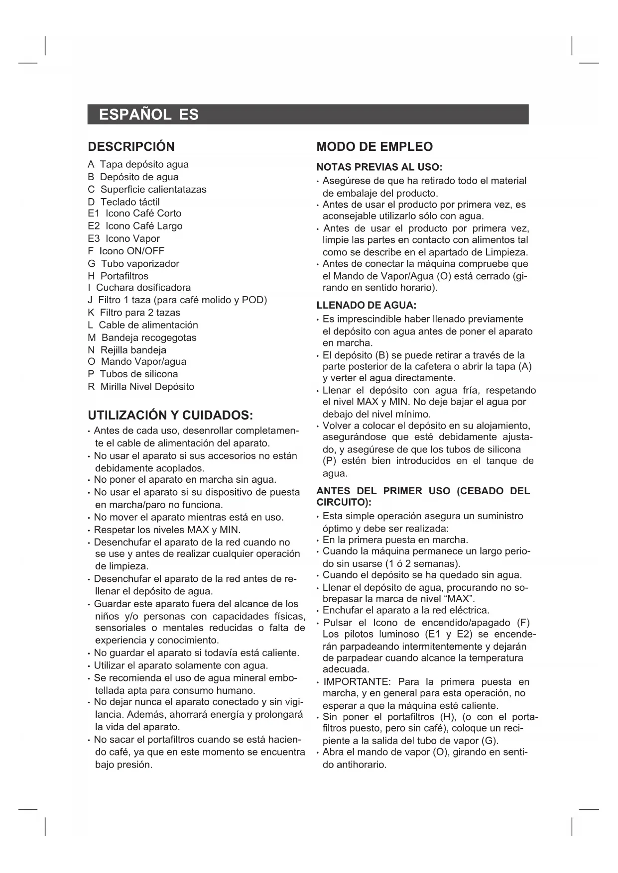 20 barESPAÑOL ES DESCRIPCIÓN A Tapa depósito agua B Depósito de agua C Supercie calientatazas D Teclado táctil E1 Icono Café Corto E2 Icono Café Largo E3 Icono Vapor F Icono ON/OFF G Tubo vaporizador H Portaltros I Cuchara dosicadora J Filtro 1 taza (para café molido y POD) K Filtro para 2 tazas L Cable de alimentación M Bandeja recogegotas N Rejilla bandeja O Mando Vapor/agua P Tubos de silicona R Mirilla Nivel Depósito UTILIZACIÓN Y CUIDADOS: