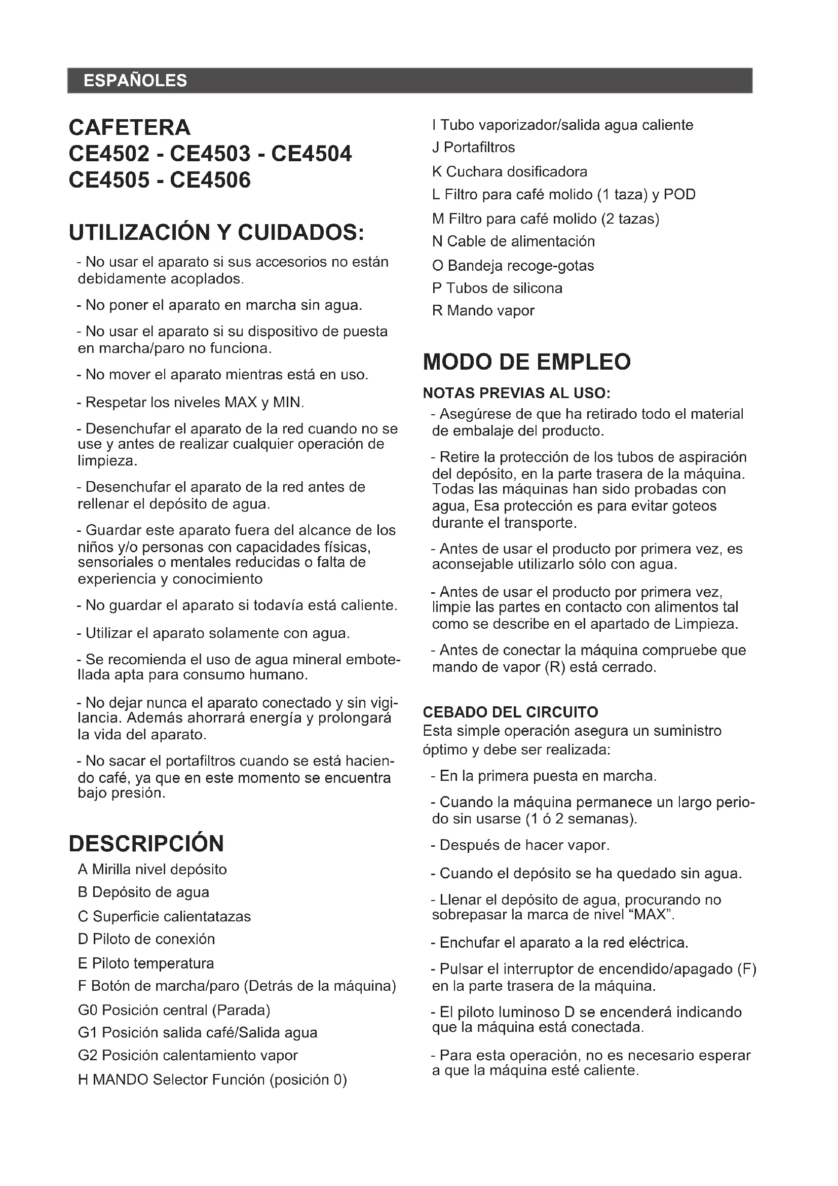 PFig.1 Fig.2 Fig.3ESPAÑOL ES CAFETERA CE4502 - CE4503 - CE4504 CE4505 - CE4506 UTILIZACIÓN Y CUIDADOS: - No usar el aparato si sus accesorios no están debidamente acoplados. - No poner el aparato en marcha sin agua. - No usar el aparato si su dispositivo de puesta en marcha/paro no funciona. - No mover el aparato mientras está en uso. - Respetar los niveles MAX y MIN. - Desenchufar el aparato de la red cuando no se use y antes de realizar cualquier operación de limpieza. - Desenchufar el aparato de la red antes de rellenar el depósito de agua. - Guardar este aparato fuera del alcance de los niños y/o personas con capacidades físicas, sensoriales o mentales reducidas o falta de experiencia y conocimiento - No guardar el aparato si todavía está caliente. - Utilizar el aparato solamente con agua. - Se recomienda el uso de agua mineral embote- llada apta para consumo humano. - No dejar nunca el aparato conectado y sin vigi- lancia. Además ahorrará energía y prolongará la vida del aparato. - No sacar el portaltros cuando se está hacien- do café, ya que en este momento se encuentra bajo presión. DESCRIPCIÓN A Mirilla nivel depósito B Depósito de agua C Supercie calientatazas D Piloto de conexión E Piloto temperatura F Botón de marcha/paro (Detrás de la máquina) G0 Posición central (Parada) G1 Posición salida café/Salida agua G2 Posición calentamiento vapor H MANDO Selector Función (posición 0) I Tubo vaporizador/salida agua caliente J Portaltros K Cuchara dosicadora L Filtro para café molido (1 taza) y POD M Filtro para café molido (2 tazas) N Cable de alimentación O Bandeja recoge-gotas P Tubos de silicona R Mando vapor