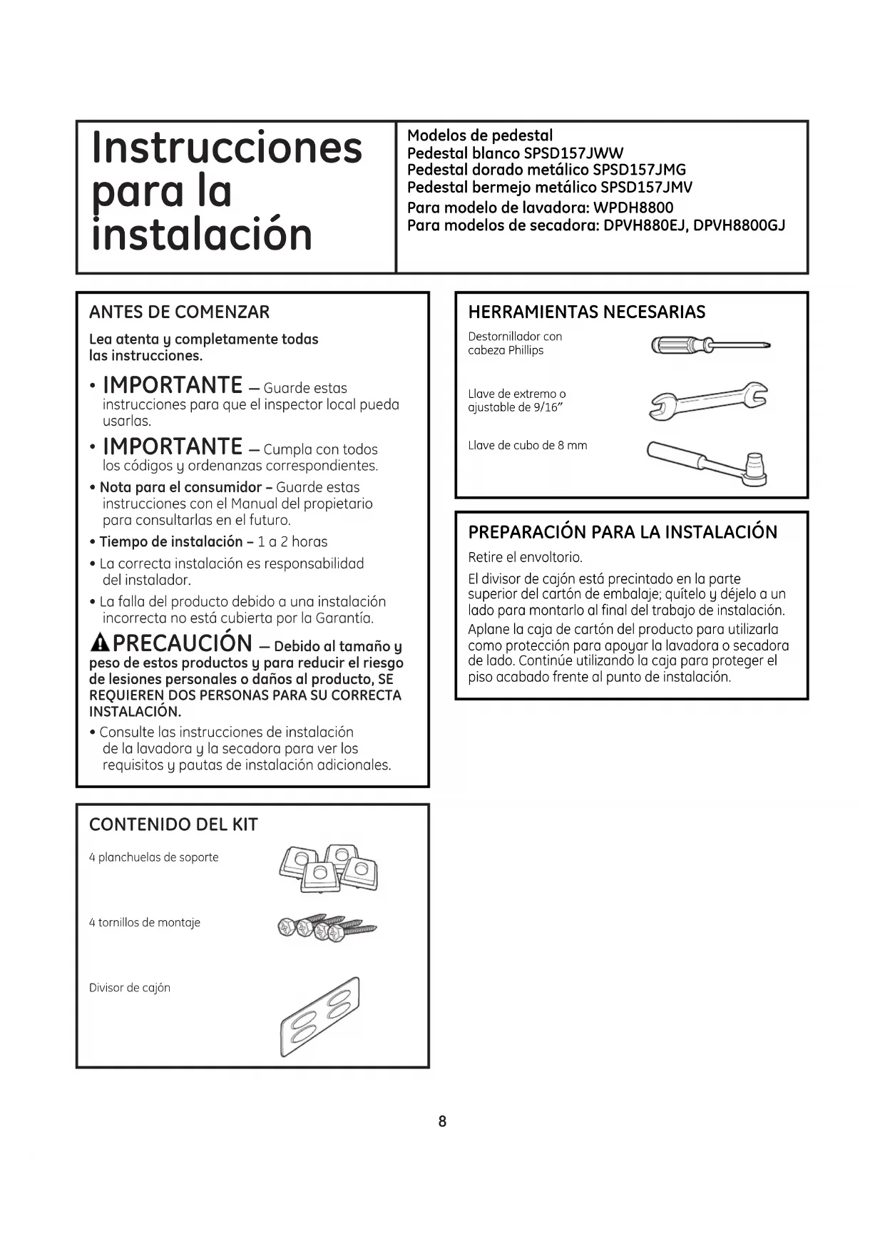 Retire el envoltorio.El divisor de cajón está precintado en la partesuperior del cartón de embalaje; quítelo y déjelo a unlado para montarlo al final del trabajo de instalación.Aplane la caja de cartón del producto para utilizarlacomo protección para apoyar la lavadora o secadorade lado. Continúe utilizando la caja para proteger elpiso acabado frente al punto de instalación. Modelos de pedestal Pedestal blanco SPSD157JWW Pedestal dorado metálico SPSD157JMG Pedestal bermejo metálico SPSD157JMV Para modelo de lavadora: WPDH8800 Para modelos de secadora: DPVH880EJ, DPVH8800GJ9 Instrucciones para la instalación