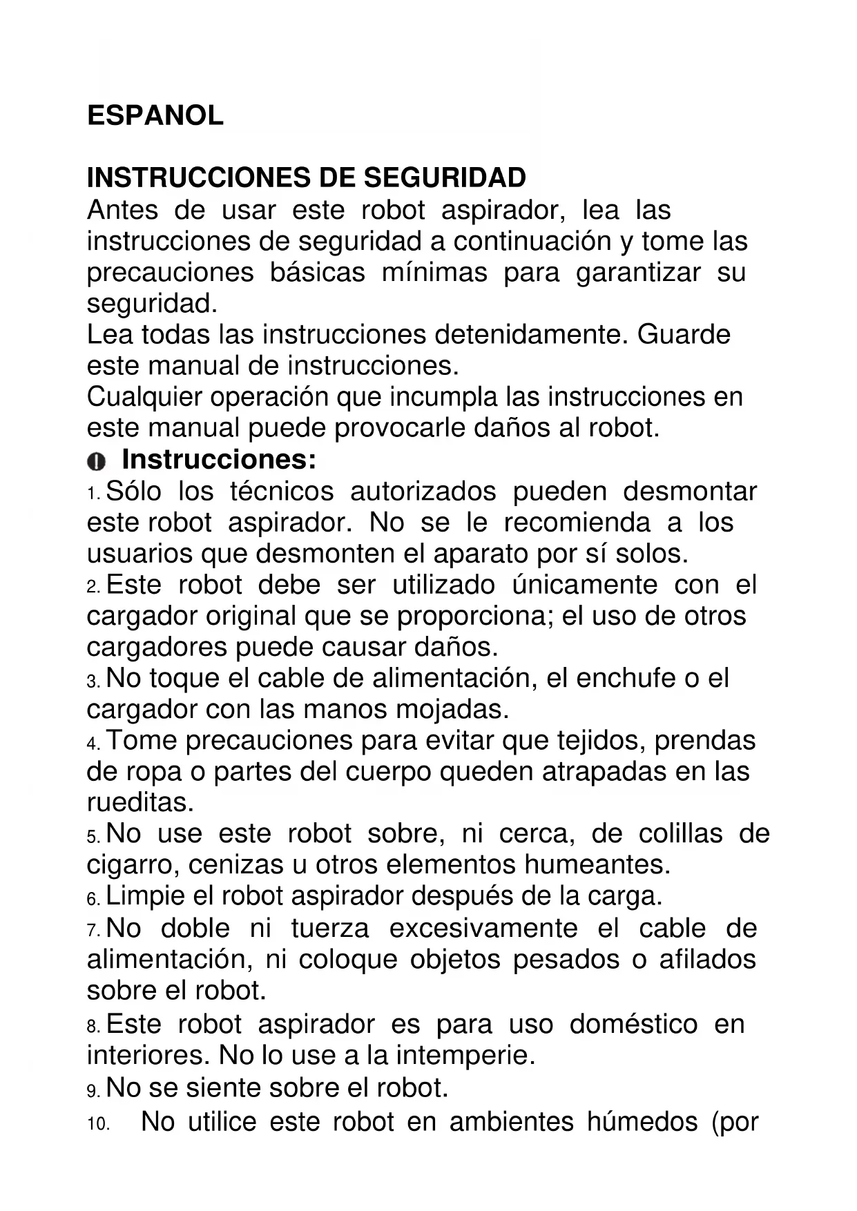 Antes de usar este robot aspirador, lea las instrucciones de seguridad a continuación y tome las precauciones básicas mínimas para garantizar su seguridad. Lea todas las instrucciones detenidamente. Guarde este manual de instrucciones. Cualquier operación que incumpla las instrucciones en este manual puede provocarle daños al robot.