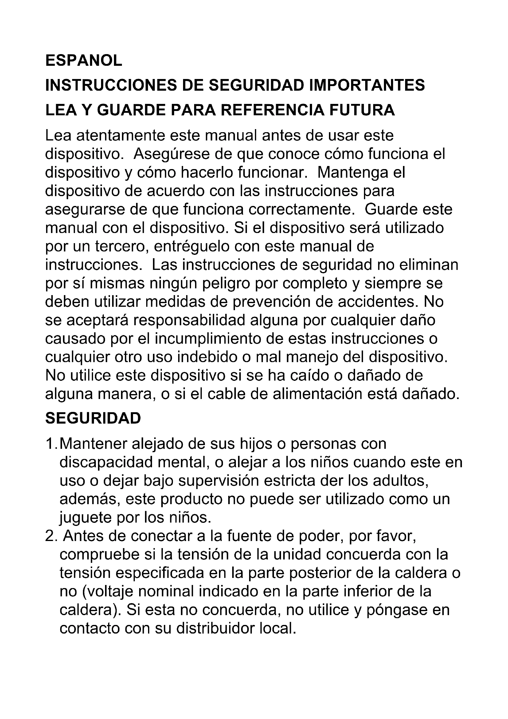compruebe si la tensión de la unidad concuerda con la tensión especificada en la parte posterior de la caldera o no (voltaje nominal indicado en la parte inferior de la caldera). Si esta no concuerda, no utilice y póngase en contacto con su distribuidor local.3. Durante el llenado de agua, limpieza, o cuando no esté en uso, apague el calentador de agua, y desconecte de la toma de corriente.