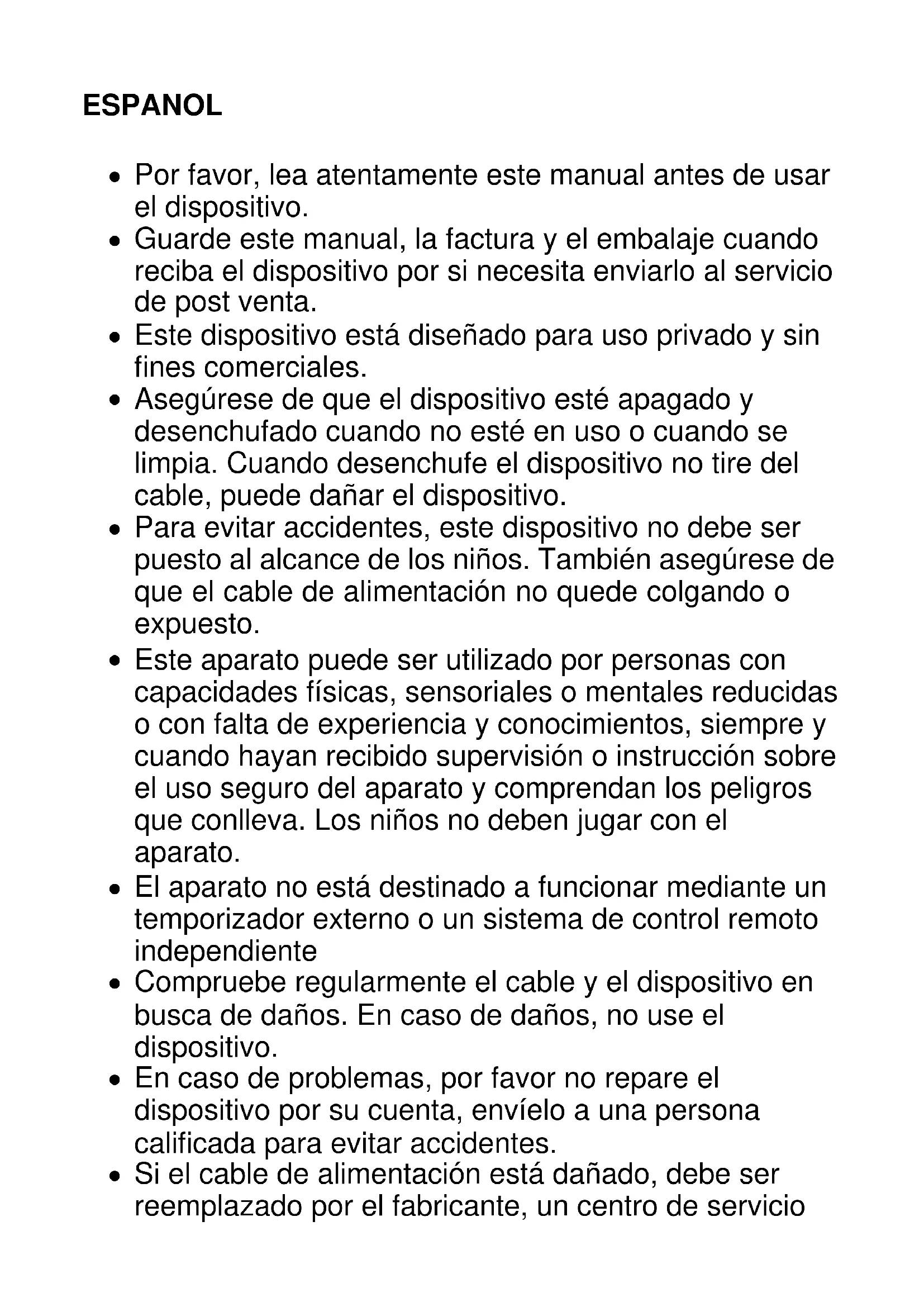 Este aparato puede ser utilizado por personas con capacidades físicas, sensoriales o mentales reducidas o con falta de experiencia y conocimientos, siempre y cuando hayan recibido supervisión o instrucción sobre el uso seguro del aparato y comprendan los peligros que conlleva. Los niños no deben jugar con el aparato.