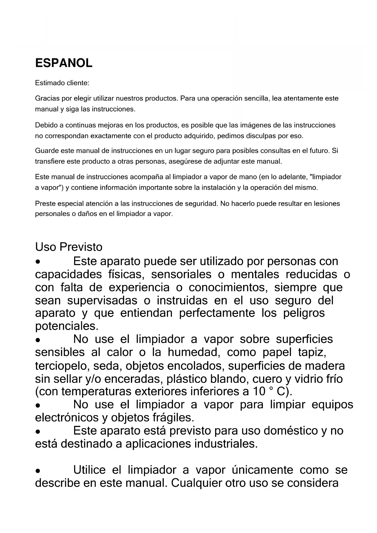 Utilice el limpiador a vapor únicamente como se describe en este manual. Cualquier otro uso se considerainapropiado.