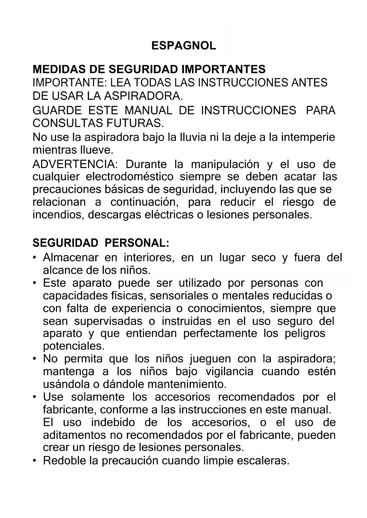 PARA CONSULTAS FUTURAS. No use la aspiradora bajo la lluvia ni la deje a la intemperie mientras llueve. ADVERTENCIA: Durante la manipulación y el uso de cualquier electrodoméstico siempre se deben acatar las precauciones básicas de seguridad, incluyendo las que se relacionan a continuación, para reducir el riesgo de incendios, descargas eléctricas o lesiones personales. SEGURIDAD PERSONAL: