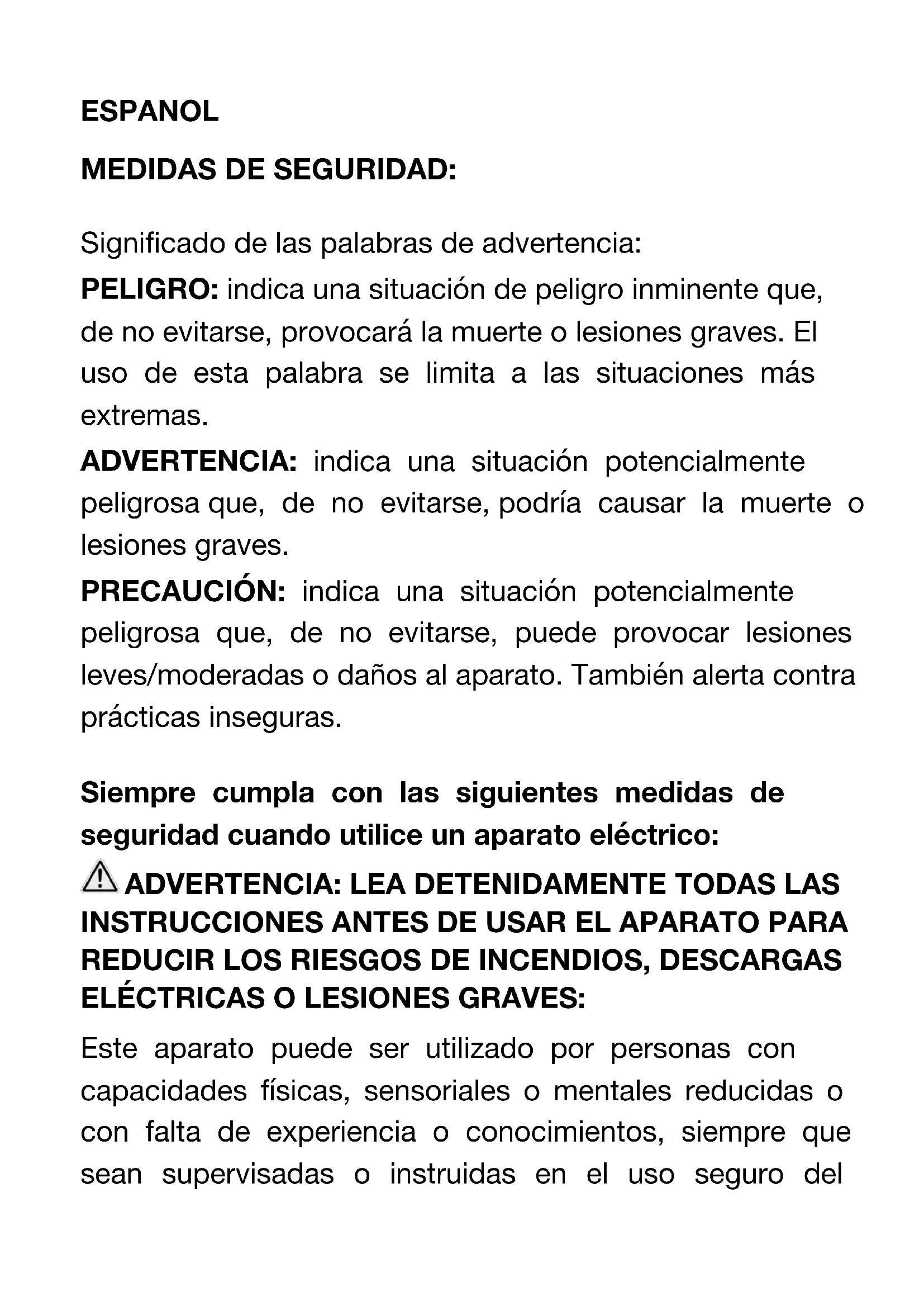 ELÉCTRICAS O LESIONES GRAVES: Este aparato puede ser utilizado por personas con capacidades físicas, sensoriales o mentales reducidas o con falta de experiencia o conocimientos, siempre que sean supervisadas o instruidas en el uso seguro delaparato y que entiendan perfectamente los peligros potenciales. La limpieza y el mantenimiento no deben ser realizados por niños a menos que sean mayores de 8 años y estén supervisados. Mantenga el aparato y el cable fuera del alcance de los niños menores de 8 años. La limpieza y el mantenimiento del usuario no deben ser realizados por niños sin supervisión. Peligro de quemaduras. Durante el funcionamiento, la temperatura de la superficie expuesta puede estar muy caliente. Coloque el aparato sobre una superficie plana, estable y resistente al calor. Asegúrese de no tocar las partes calientes del aparato. Usar en un área bien ventilada. Mantenga al menos 4-6 pulgadas de espacio en todos los lados del aparato para permitir una circulación de aire adecuada. No coloque el aparato sobre o cerca de una estufa de gas, cocina eléctrica u horno caliente. antenga las cortinas, muebles, materiales inflamables, etc. alejados del aparato y del tomacorriente donde el mismo está conectado. No toque las superficies calientes. No lo mueva mientras está enchufado. Nunca lo toque antes de que se enfríe para evitar escaldaduras.Nunca use accesorios que no sean recomendados por el fabricante o vendidos con la unidad. No utilice el aparato cerca de agua u otros líquidos. No coloque ni deje caer el aparato en el agua u otros líquidos. Si por accidente cae al agua, desenchúfelo inmediatamente del tomacorriente y no toque el agua. Este aparato no está diseñado para ser operado por medio de un temporizador externo o un sistema de control remoto. Nunca lo deje desatendido mientras esté en uso. No limpie el aparato con agua y no lo sumerja en ningún líquido. Nunca tire del cable de alimentación ya que podría romperse. No enchufe o desenchufe el aparato con las manos mojadas. Mantenga el aparato y su cable de alimentación alejado de objetos calientes. No use el aparato si el cable de alimentación o enchufe están dañados o si no funcionan correctamente. Si el cable de alimentación está dañado, debe ser reemplazado por el fabricante, su agente de servicio o una persona calificada competente para evitar peligros. Este aparato está destinado al uso en hogares y áreas similares, como : - zonas de cocina en tiendas, oficinas y otros entornos de trabajo- en casas de campo - en hoteles, moteles y otras zonas residenciales - habitaciones de huéspedes. Este aparato puede ser utilizado por niños de al menos 8 años de edad, siempre que cuenten con supervisión y hayan recibido instrucciones sobre el uso seguro del electrodoméstico y sean plenamente conscientes de los peligros que implica. PRECAUCIÓN: PARA REDUCIR EL RIESGO DE LESIONES PERSONALES O DAÑOS AL APARATO: