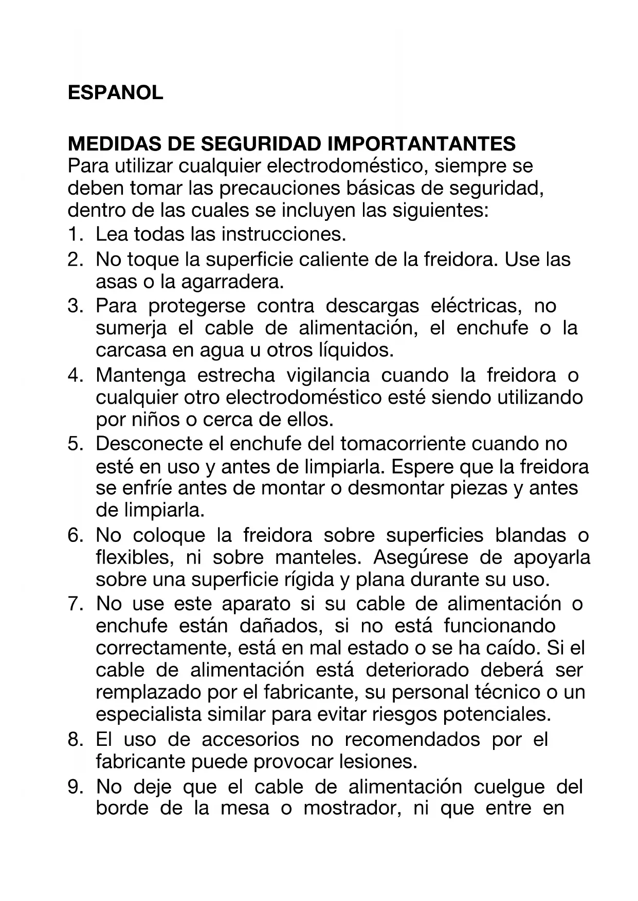 graves si la freidora se vira o se cae del mostrador con aceite caliente en su interior. No permita que el cable de alimentación cuelgue del borde de la mesa o se extienda por donde los niños puedan agarrarlo o tropezar.