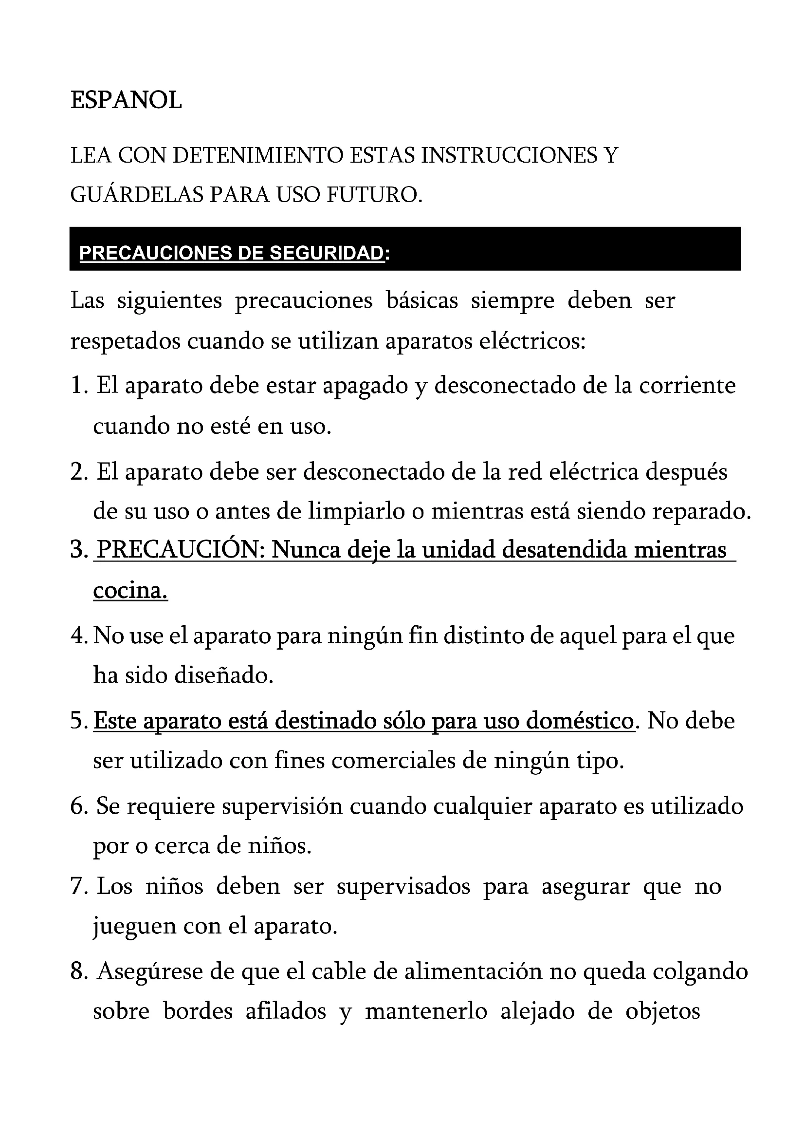GUÁRDELAS PARA USO FUTURO. Las siguientes precauciones básicas siempre deben ser respetados cuando se utilizan aparatos eléctricos: