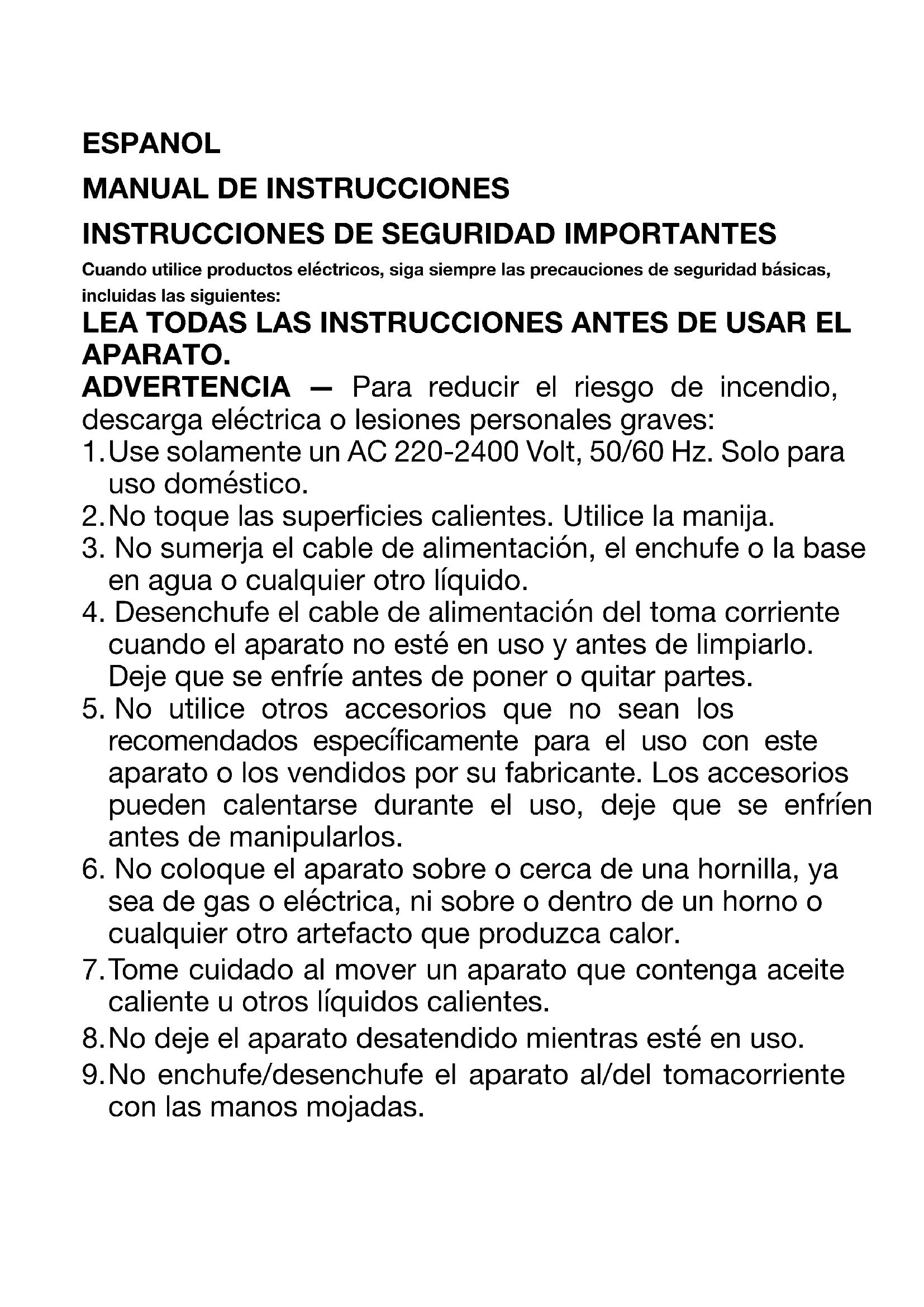 Cuando utilice productos eléctricos, siga siempre las precauciones de seguridad básicas, incluidas las siguientes: LEA TODAS LAS INSTRUCCIONES ANTES DE USAR EL APARATO. ADVERTENCIA — Para reducir el riesgo de incendio, descarga eléctrica o lesiones personales graves: