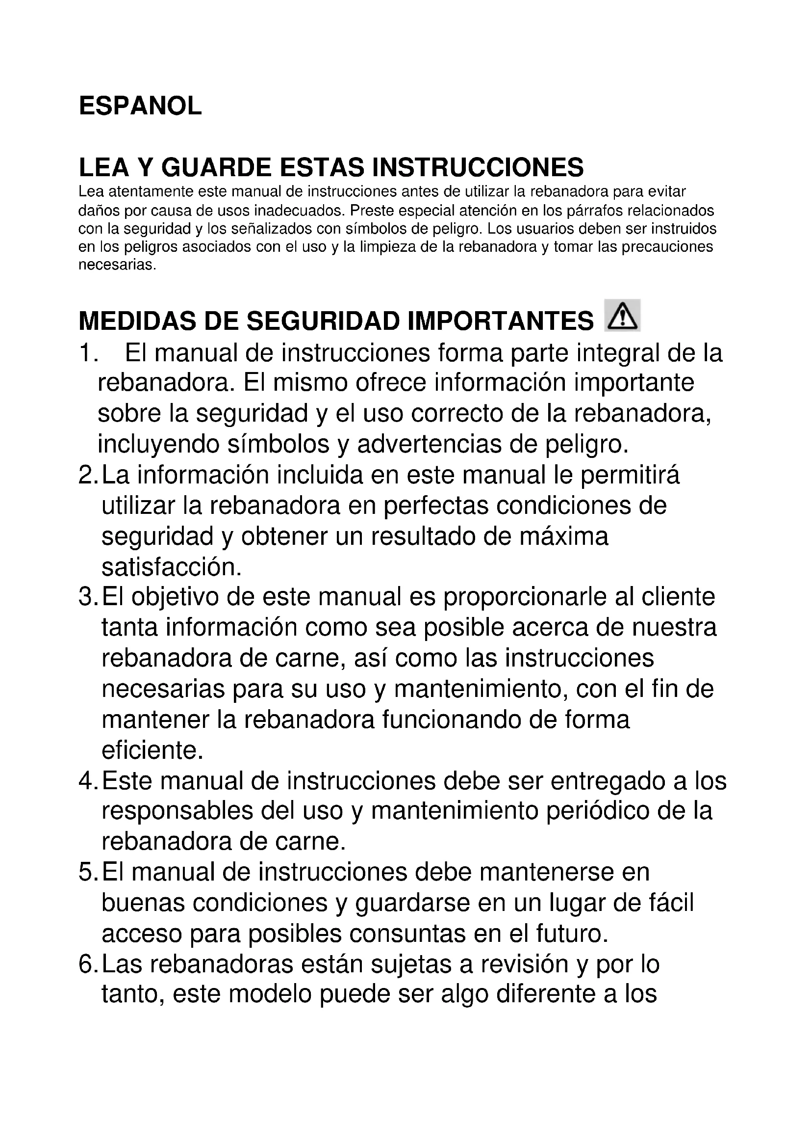 Lea atentamente este manual de instrucciones antes de utilizar la rebanadora para evitar daños por causa de usos inadecuados. Preste especial atención en los párrafos relacionados con la seguridad y los señalizados con símbolos de peligro. Los usuarios deben ser instruidos en los peligros asociados con el uso y la limpieza de la rebanadora y tomar las precauciones necesarias.