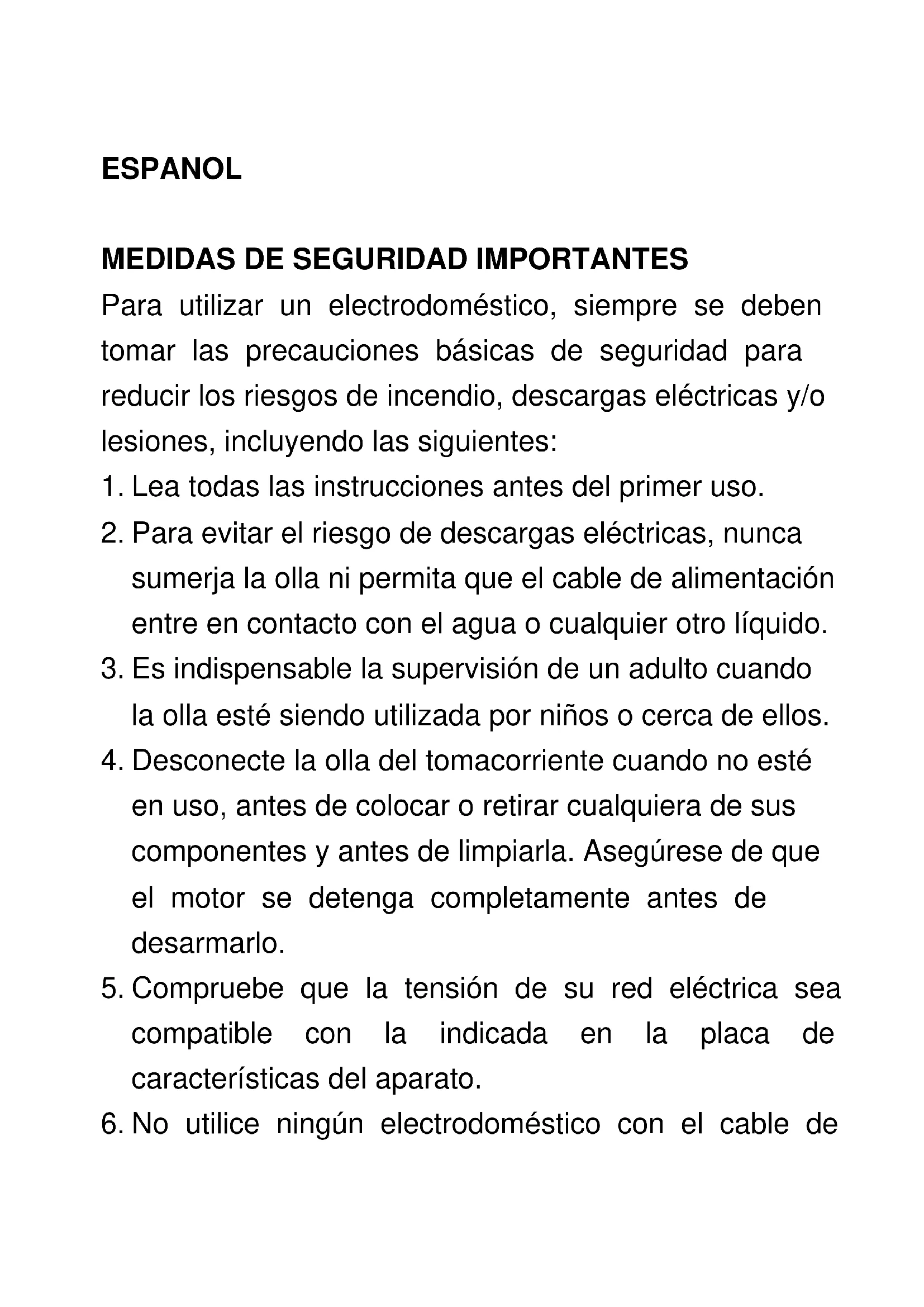 Para evitar el riesgo de descargas eléctricas, nunca sumerja la olla ni permita que el cable de alimentación entre en contacto con el agua o cualquier otro líquido.