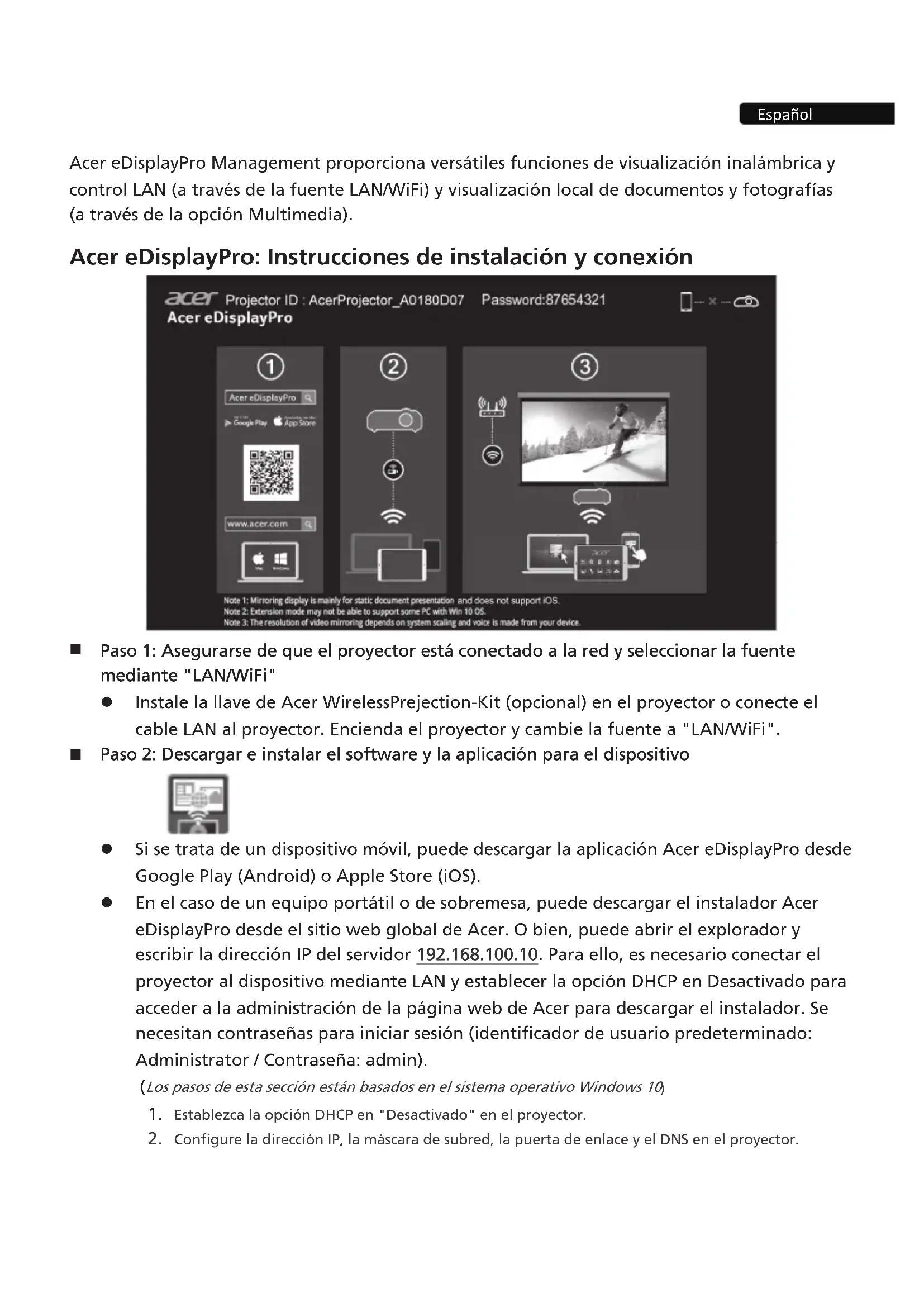ile Español Acer eDisplayPro Management proporciona versátiles funciones de visualización inalámbrica y control LAN (a través de la fuente LAN/WiFi) y visualización local de documentos y fotografías (a través de la opción Multimedia). Acer eDisplayPro: Instrucciones de instalación y conexión