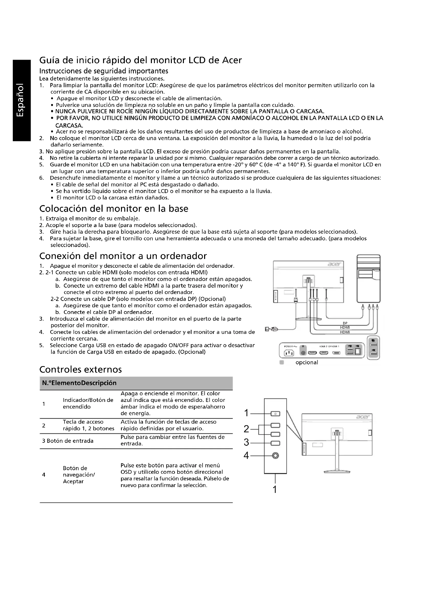 Contraste 100000000:1 Máx. (ACM) Ángulo de visión 178° (horizontal) 178° (vertical) (CR=10) Tiempo de respuesta 1 ms (G a G) / 0,5 ms (G a G, min.) Tipo de panel In-Plane Switching Frecuencia H HDMI: 31 - 222 kHz / DP: 31 - 395 kHz Frecuencia V HDMI: 56 - 144 Hz / DP: 56 - 270 Hz Colores de la pantalla 16,7 millones Reloj de punto HDMI: 595,5 MHz / DP: 1056,97 MHz Resolución máxima HDMI: 2560 x 1440 @ 144 Hz / DP: 2560 x 1440 @ 240 Hz DP: 2560 x 1440 @ 270 Hz (Con Aum. vel. reloj ACTIVADO) Plug & Play VESA DDCCI/DDC2B Clase de eficiencia energética C *Consumo de energía anual 86 (kWh) (para el modelo de entrada HDMI) Consumo de energía (a 200 unidades) Modo encendido 45 W (típico) Modo de suspensión 0,45 W (típico) Modo apagado 0,3 W (típico) Conector de entrada HDMI (solo el modelo de entrada HDMI) / DP (solo el modelo de entrada DP) Señal de entrada de vídeo HDMI (solo el modelo de entrada HDMI) (Opcional) / DP (solo el modelo de entrada DP) (Opcional) Altavoces 2 W x 2 (Solo modelo de entrada de audio) (Opcional) USB USB 3.0 x 4 (Opcional) Tamaño máximo de pantalla Horizontal: 708,4 mm Vertical: 398,5 mm Fuente de alimentación 100-240 V, 50/60 Hz Consideraciones ambientales Temperatura de funcionamiento: de 0º a 40º C Temperatura de almacenamiento: de -20º a 60º C Humedad de funcionamiento: entre el 20% y el 80% Dimensiones 727,48 (ancho) x 479,18 ~ 609,18 (alto) x 269 (diagonal) mm Peso (peso neto) 9,5 kg (neto) Especificaciones de funcionamiento Inclinación: de -5º a +35º (el grado de inclinación máximo en el punto más alto es de 35 grados) Giro: 360° Ajuste de altura: de 0 mm a 130 mm Pivote: No Soporte extraíble: Sí Controles externos Interrruptor/Botones Botón de encendido Tecla rápida 1 Tecla rápida 2 Entrada Menú/Navegación/Aceptar Funciones Brillo Contraste Luz azul Aumento de negro ACM HDR*** Supernitidez Gamma Temp. Color Modos Espacio de color Modo escala gris Matiz de 6 ejes Satur. 6 ejes Volumen Silencio Sobrecarga FreeSync Premium** Tasa de actual. Latencia ultrabaja Punto de mira Idioma T. de espera OSD Transparencia Bloqueo OSD Entrada Fuente automát. Formato DP Asignac. teclas rápidas Modo panorámico PIP/PBP DDC/CI Nivel negro HDMI Modo inicio ráp. Aum. vel. reloj# Carga USB en estado de apagado Información de la pantalla Restablecer config. Salida Las especificaciones varían en función del modelo o la región.Français Guide de démarrage rapide (GDR) – Moniteur LCD Acer Instructions importantes de sécurité Veuillez lire attentivement les instructions ci-dessous. 1. Pour nettoyer l'écran du moniteur LCD : Assurez-vous que l'alimentation requise pour votre moniteur correspond à l'alimentation secteur dans la zone géographique où vous vous trouvez.• Éteignez le moniteur LCD et débranchez le cordon d'alimentation.