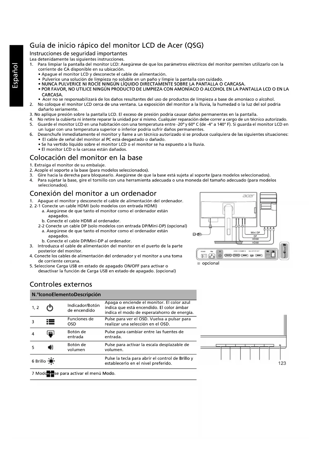 Mini DPPOWERHDMI 2 HDMI 1 DP INMini DP DP OUT opcional 1234567Español Normativa y avisos de seguridad Aviso de la FCC Este dispositivo se ha probado y comprobado que cumple con los límites para un dispositivo digital de Clase B conforme a la Parte 15 de las normas de la FCC. Estos límites están diseñados para proporcionar una protección razonable frente a interferencias dañinas en una instalación residencial. Este dispositivo genera, utiliza y puede irradiar energía de radiofrecuencia y, si no se instala ni utiliza conforme a las instrucciones, podría causar interferencias dañinas en las comunicaciones de radio. No obstante, no puede garantizarse que las interferencias no se produzcan en instalaciones concretas. Si este dispositivo causa interferencias dañinas en la recepción de radio o televisión, lo que puede determinarse apagando y encendiendo el dispositivo, el usuario puede intentar solucionar las interferencias de las siguientes maneras: Cambiar la orientación de la antena receptora o colocarla en otro lugar. Aumentar la separación entre el dispositivo y el receptor. Conectar el dispositivo a una toma de corriente en un circuito distinto al que se ha conectado el receptor. Consulte con el distribuidor o un técnico especializado en radio y televisión para recibir asistencia. Declaración de conformidad CE Por la presente, Acer Inc. declara que este monitor LCD cumple con los requisitos y otras provisiones relevantes de la directiva EMC 2014/30/EU, la directiva de bajo voltaje 2014/35/EU, la directiva RoHS 2011/65/EU y la directiva 2009/125/EC relacionadas con la creación de un marco para el establecimiento de requisitos de ecodiseño para productos relacionados con la energía. Aviso: Para evitar daños en el monitor, no lo levante sujetándolo por la base. Aviso: Cables blindados Las conexiones a otros dispositivos informáticos deben realizarse con cables blindados, a fin de cumplir con las normativas de la EMC. Aviso: Dispositivos periféricos Solo deben conectarse a este equipo aquellos periféricos (dispositivos de entrada/salida, terminales, impresoras, etc.) certificados que cumplan con los límites de la Clase B. Si se utiliza con periféricos sin certificación, es posible que se produzcan interferencias en la recepción de radio y televisión. Precaución Cualquier cambio o modificación no aprobado expresamente por el fabricante podría anular la autoridad del usuario, concedida por la Comisión Federal de Comunicaciones, para utilizar el producto. Condiciones de funcionamiento Este dispositivo cumple con la Parte 15 de las normas de la FCC. El funcionamiento está sujeto a las siguientes condiciones: (1) este dispositivo no puede causar interferencias dañinas y (2) este dispositivo debe aceptar cualquier interferencia recibida, incluidas aquellas que puedan provocar un funcionamiento no deseado. Aviso: Usuarios de Canadá Este aparato digital de Clase B cumple con la normativa canadiense ICES-003. Remarque à l'intention des utilisateurs canadiens Cet appareil numérique de la classe B est conforme à la norme NMB-003 du Canada. Eliminación de equipo obsoleto por parte de los usuarios en una vivienda privada en la Unión Europea La aparición de este símbolo en el producto o su embalaje indica que no es posible eliminarlo con el resto de residuos domésticos. En su lugar, el usuario es responsable de eliminar el equipo obsoleto llevándolo a un punto de recogida designado para el reciclaje de equipo eléctrico y electrónico. El reciclaje y la recogida por separado del equipo obsoleto en el momento de su eliminación ayudarán a conservar los recursos naturales y garantizar que se recicla de una forma que proteja la salud humana y el medio ambiente. Para obtener más información sobre dónde puede llevar su equipo obsoleto para reciclarlo, póngase en contacto con el ayuntamiento de su localidad, el servicio de eliminación de residuos o el establecimiento donde compró el producto. Mensaje de advertencia sobre fuentes magnéticas Ciertos aparatos electrónicos, como discos duros, dispositivos USB, tablets, portátiles, teléfonos móviles, relojes, auriculares, altavoces, tarjetas de crédito, tarjetas de identificación magnéticas, etc., son sensibles a los campos magnéticos y podrían sufrir daños temporales o permanentes si se exponen a campos magnéticos muy fuertes. No debe colocar dispositivos electrónicos cerca de la zona magnética de la base del monitor o sobre ella. MagnetEspañol ESPECIFICACIONES Puede encontrar manuales y otros documentos para su producto de Acer en el sitio web oficial de asistencia de Acer. *El consumo de energía anual se calcula a partir del consumo de energía típico de 4 horas al día, los 365 días del año. Panel LCD Sistema de conducción Pantalla LCD TFT en color Tamaño 27”W (69 cm) Distancia entre píxeles 0,233 mm (horizontal) x 0,233 mm (vertical) Brillo 350 cd/m