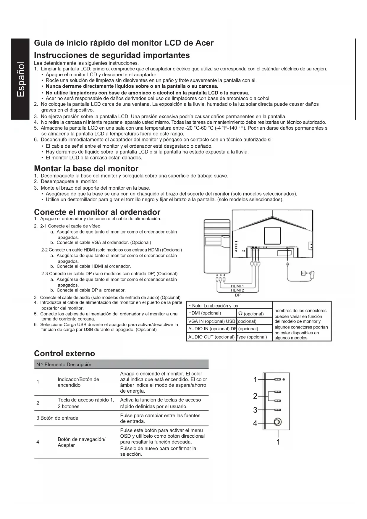 Consumo de energía Modo Encendido 20 W (típico) Modo de suspensión 0,5 W (típico) Modo apagado 0,3 W (típico) Conector de entrada DP (solo el modelo de entrada DP) HDMI ×2 (solo el modelo con entrada HDMI) Señal de vídeo de entrada DP (solo el modelo de entrada DP) HDMI ×2 (solo el modelo con entrada HDMI) Altavoces 2 W × 2 USB USB3.0 × 4 (opcional) Tamaño máximo de pantalla Horizontal: 597 mm Vertical: 336 mm Fuente de alimentación ENTRADA: 100-240 V~ 50/60 Hz Condiciones medioambientales Temperatura de funcionamiento: 0° a 40°C Temperatura de almacenamiento: -20° a 60°C Humedad de funcionamiento: 20% a 80% Dimensiones 610,5 (An.) × 406-556 (Al.) × 247 (Pr.) mm Peso (neto) 6,4 kg (neto) Especificaciones del mecanismo Inclinación: -5° a +35° Plataforma giratoria: ±60° Ajuste de la altura: 150 mm Giro: No Base de pie desmontable: Sí Controles externos Interruptor/Botones Botón de alimentación Acceso directo 1 Acceso directo 2 Entrada Menú/Navegación/Aceptar Funciones Brillo Contraste Luz azul Aumento de negro ACM Supernitidez Gamma Temp. Color Modos Modo sRGB Modo escala gris Matiz de 6 ejes Satur. 6 ejes Volumen Silencio Over Drive Adaptive-Sync Tasa de actual. Idioma T. de espera OSD Transparencia Bloqueo OSD Entrada Fuente automát. Modo panorámico Asignac. teclas rápidas DDC/CI Nivel negro HDMI Modo inicio ráp. Carga USB en estado de apagad Información Las especificaciones varían en función del modelo o la región. Busque los manuales y otros documentos para el producto Acer en el sitio Web de soporte técnico de Acer oficial.Français Guide de démarrage rapide (GDR) – Moniteur LCD Acer Instructions importantes de sécurité Veuillez lire attentivement les instructions ci-dessous. 1. Nettoyage de l’écran LCD : assurez-vous d’abord que l’adaptateur d’alimentation que vous utilisez correspond aux normes électriques de votre région.