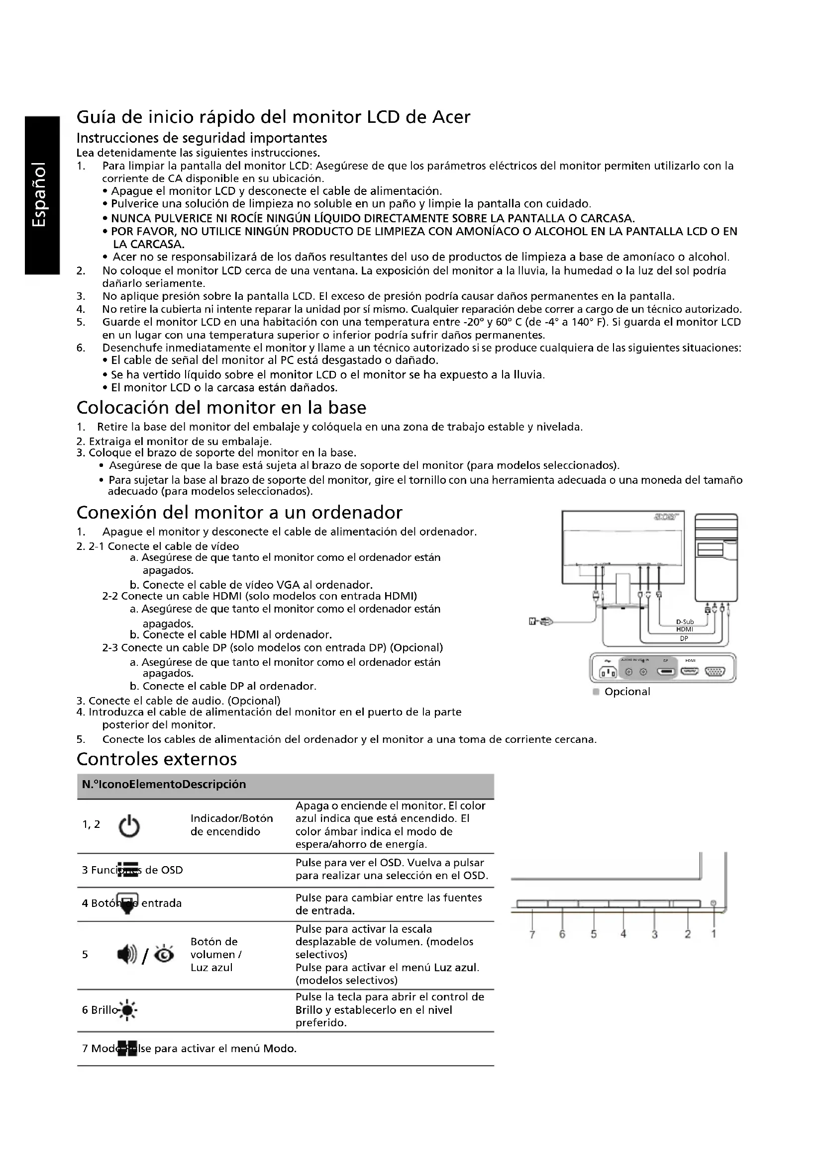 OpcionalEspañol Normativa y avisos de seguridad Aviso de la FCC Este dispositivo se ha probado y comprobado que cumple con los límites para un dispositivo digital de Clase B conforme a la Parte 15 de las normas de la FCC. Estos límites están diseñados para proporcionar una protección razonable frente a interferencias dañinas en una instalación residencial. Este dispositivo genera, utiliza y puede irradiar energía de radiofrecuencia y, si no se instala ni utiliza conforme a las instrucciones, podría causar interferencias dañinas en las comunicaciones de radio. No obstante, no puede garantizarse que las interferencias no se produzcan en instalaciones concretas. Si este dispositivo causa interferencias dañinas en la recepción de radio o televisión, lo que puede determinarse apagando y encendiendo el dispositivo, el usuario puede intentar solucionar las interferencias de las siguientes maneras: Cambiar la orientación de la antena receptora o colocarla en otro lugar. Aumentar la separación entre el dispositivo y el receptor. Conectar el dispositivo a una toma de corriente en un circuito distinto al que se ha conectado el receptor. Consulte con el distribuidor o un técnico especializado en radio y televisión para recibir asistencia. Declaración de conformidad CE Por la presente, Acer Inc. declara que este monitor LCD cumple con los requisitos y otras provisiones relevantes de la directiva EMC 2014/30/EU, la directiva de bajo voltaje 2014/35/EU, la directiva RoHS 2011/65/EU y la directiva 2009/125/EC relacionadas con la creación de un marco para el establecimiento de requisitos de ecodiseño para productos relacionados con la energía. Aviso: Para evitar daños en el monitor, no lo levante sujetándolo por la base. Aviso: Cables blindados Las conexiones a otros dispositivos informáticos deben realizarse con cables blindados, a fin de cumplir con las normativas de la EMC. Aviso: Dispositivos periféricos Solo deben conectarse a este equipo aquellos periféricos (dispositivos de entrada/salida, terminales, impresoras, etc.) certificados que cumplan con los límites de la Clase B. Si se utiliza con periféricos sin certificación, es posible que se produzcan interferencias en la recepción de radio y televisión. Precaución Cualquier cambio o modificación no aprobado expresamente por el fabricante podría anular la autoridad del usuario, concedida por la Comisión Federal de Comunicaciones, para utilizar el producto. Condiciones de funcionamiento Este dispositivo cumple con la Parte 15 de las normas de la FCC. El funcionamiento está sujeto a las siguientes condiciones: (1) este dispositivo no puede causar interferencias dañinas y (2) este dispositivo debe aceptar cualquier interferencia recibida, incluidas aquellas que puedan provocar un funcionamiento no deseado. Aviso: Usuarios de Canadá Este aparato digital de Clase B cumple con la normativa canadiense ICES-003. Remarque à l'intention des utilisateurs canadiens Cet appareil numérique de la classe B est conforme à la norme NMB-003 du Canada. Eliminación de equipo obsoleto por parte de los usuarios en una vivienda privada en la Unión Europea La aparición de este símbolo en el producto o su embalaje indica que no es posible eliminarlo con el resto de residuos domésticos. En su lugar, el usuario es responsable de eliminar el equipo obsoleto llevándolo a un punto de recogida designado para el reciclaje de equipo eléctrico y electrónico. El reciclaje y la recogida por separado del equipo obsoleto en el momento de su eliminación ayudarán a conservar los recursos naturales y garantizar que se recicla de una forma que proteja la salud humana y el medio ambiente. Para obtener más información sobre dónde puede llevar su equipo obsoleto para reciclarlo, póngase en contacto con el ayuntamiento de su localidad, el servicio de eliminación de residuos o el establecimiento donde compró el producto.Español ESPECIFICACIONES Puede encontrar manuales y otros documentos para su producto de Acer en el sitio web oficial de asistencia de Acer. Panel LCD Sistema de conducción Pantalla LCD TFT en color Tamaño 21,5”W (55 cm) Distancia entre píxeles 0,248 mm (horizontal) x 0,248 mm (vertical) Brillo 250 cd/m