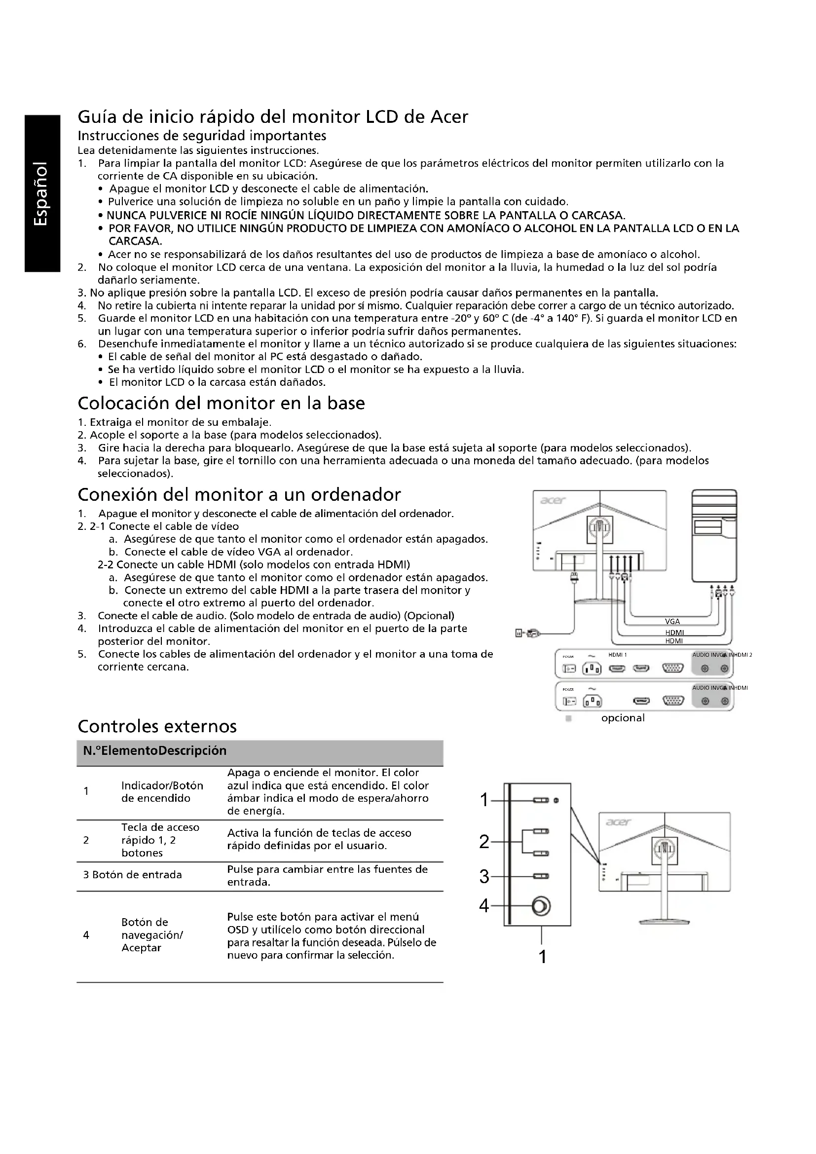 4Español Normativa y avisos de seguridad Aviso de la FCC Este dispositivo se ha probado y comprobado que cumple con los límites para un dispositivo digital de Clase B conforme a la Parte 15 de las normas de la FCC. Estos límites están diseñados para proporcionar una protección razonable frente a interferencias dañinas en una instalación residencial. Este dispositivo genera, utiliza y puede irradiar energía de radiofrecuencia y, si no se instala ni utiliza conforme a las instrucciones, podría causar interferencias dañinas en las comunicaciones de radio. No obstante, no puede garantizarse que las interferencias no se produzcan en instalaciones concretas. Si este dispositivo causa interferencias dañinas en la recepción de radio o televisión, lo que puede determinarse apagando y encendiendo el dispositivo, el usuario puede intentar solucionar las interferencias de las siguientes maneras: Cambiar la orientación de la antena receptora o colocarla en otro lugar. Aumentar la separación entre el dispositivo y el receptor. Conectar el dispositivo a una toma de corriente en un circuito distinto al que se ha conectado el receptor. Consulte con el distribuidor o un técnico especializado en radio y televisión para recibir asistencia. Declaración de conformidad CE Por la presente, Acer Inc. declara que este monitor LCD cumple con los requisitos y otras provisiones relevantes de la directiva EMC 2014/30/EU, la directiva de bajo voltaje 2014/35/EU, la directiva RoHS 2011/65/EU y la directiva 2009/125/EC relacionadas con la creación de un marco para el establecimiento de requisitos de ecodiseño para productos relacionados con la energía. Aviso: Para evitar daños en el monitor, no lo levante sujetándolo por la base. Aviso: Cables blindados Las conexiones a otros dispositivos informáticos deben realizarse con cables blindados, a fin de cumplir con las normativas de la EMC. Aviso: Dispositivos periféricos Solo deben conectarse a este equipo aquellos periféricos (dispositivos de entrada/salida, terminales, impresoras, etc.) certificados que cumplan con los límites de la Clase B. Si se utiliza con periféricos sin certificación, es posible que se produzcan interferencias en la recepción de radio y televisión. Precaución Cualquier cambio o modificación no aprobado expresamente por el fabricante podría anular la autoridad del usuario, concedida por la Comisión Federal de Comunicaciones, para utilizar el producto. Condiciones de funcionamiento Este dispositivo cumple con la Parte 15 de las normas de la FCC. El funcionamiento está sujeto a las siguientes condiciones: (1) este dispositivo no puede causar interferencias dañinas y (2) este dispositivo debe aceptar cualquier interferencia recibida, incluidas aquellas que puedan provocar un funcionamiento no deseado. Aviso: Usuarios de Canadá Este aparato digital de Clase B cumple con la normativa CAN ICES-003(B)/NMB-003(B). Remarque à l'intention des utilisateurs canadiens Cet appareil numérique de la classe B est conforme à la norme NMB-003 du Canada. Eliminación de equipo obsoleto por parte de los usuarios en una vivienda privada en la Unión Europea La aparición de este símbolo en el producto o su embalaje indica que no es posible eliminarlo con el resto de residuos domésticos. En su lugar, el usuario es responsable de eliminar el equipo obsoleto llevándolo a un punto de recogida designado para el reciclaje de equipo eléctrico y electrónico. El reciclaje y la recogida por separado del equipo obsoleto en el momento de su eliminación ayudarán a conservar los recursos naturales y garantizar que se recicla de una forma que proteja la salud humana y el medio ambiente. Para obtener más información sobre dónde puede llevar su equipo obsoleto para reciclarlo, póngase en contacto con el ayuntamiento de su localidad, el servicio de eliminación de residuos o el establecimiento donde compró el producto.Español ESPECIFICACIONES Puede encontrar manuales y otros documentos para su producto de Acer en el sitio web oficial de asistencia de Acer. Panel LCD Sistema de conducción Pantalla LCD TFT en color Tamaño 23,8”W (60 cm) Distancia entre píxeles 0,2745 mm (horizontal) x 0,2745 mm (vertical) Brillo 250 cd/m