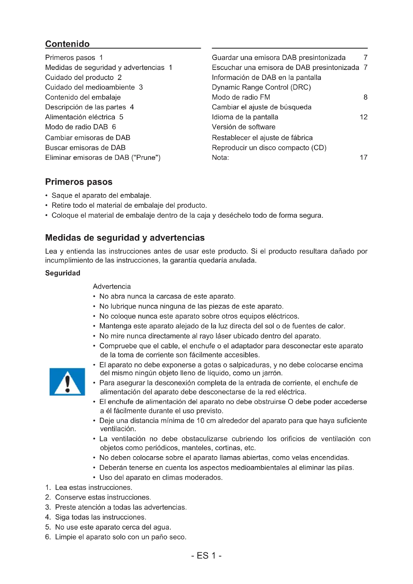 Primeros pasos 1 Medidas de seguridad y advertencias 1 Cuidado del producto 2 Cuidado del medioambiente 3 Contenido del embalaje 3 Descripción de las partes 4 Alimentación eléctrica 5 Modo de radio DAB 6 Cambiar emisoras de DAB 6 Buscar emisoras de DAB 6 Eliminar emisoras de DAB ("Prune") 6 Guardar una emisora DAB presintonizada 7 Escuchar una emisora de DAB presintonizada 7 Información de DAB en la pantalla 7 Dynamic Range Control (DRC) 7 Modo de radio FM 8 Cambiar el ajuste de búsqueda 8 Idioma de la pantalla 12 Versión de software 12 Restablecer el ajuste de fábrica 12 Reproducir un disco compacto (CD) 12 Nota: 17 Contenido- ES 2 -
